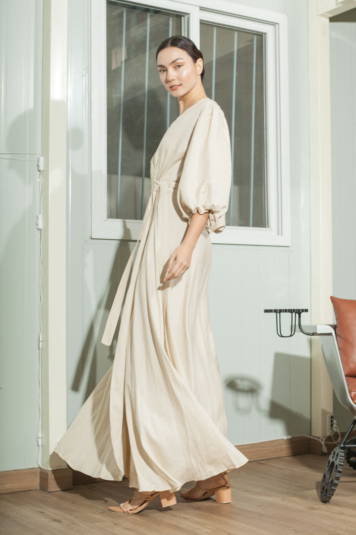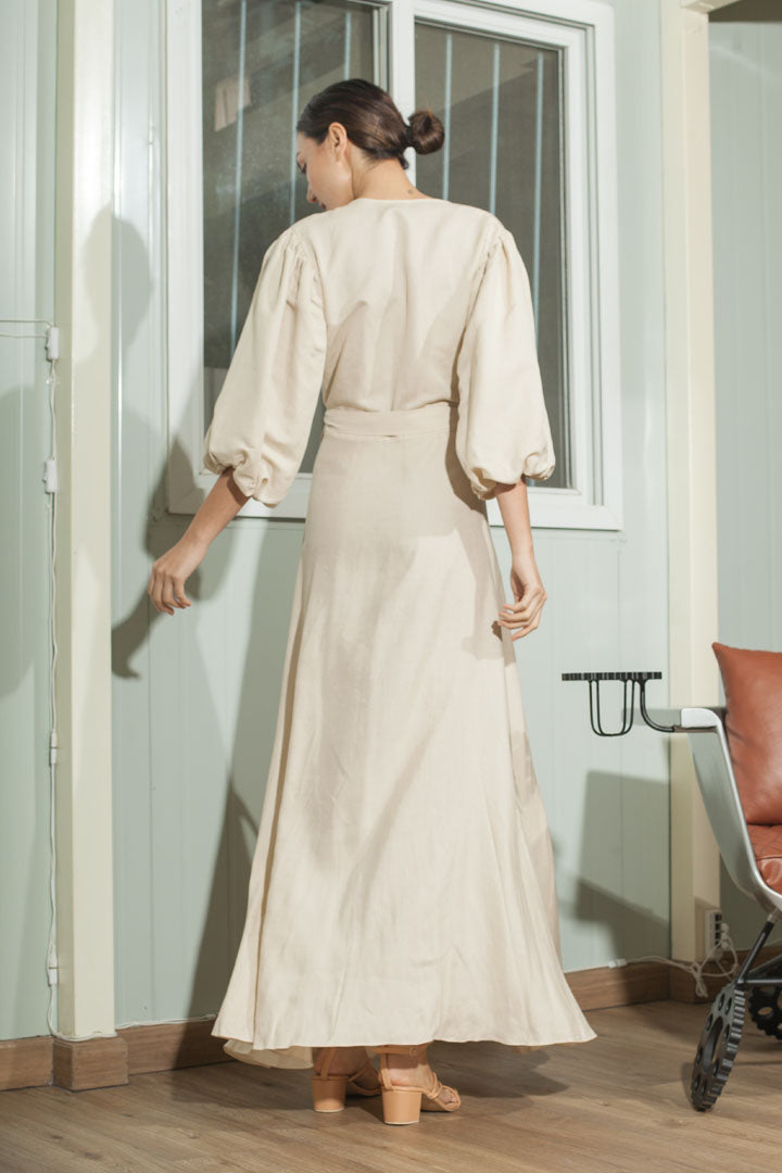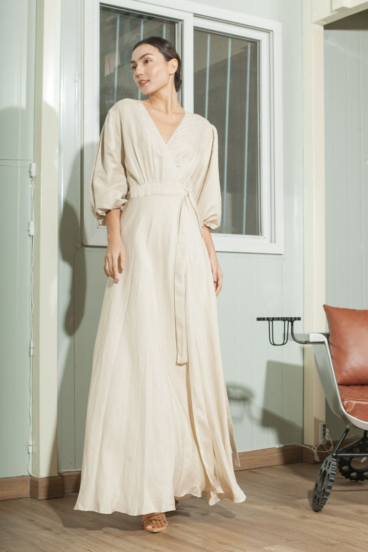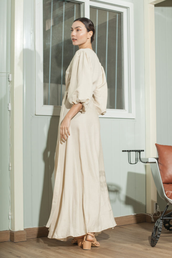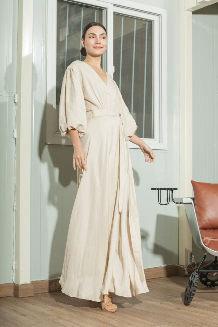 3/4 Mushroom Sleeve Wrap Long Dress — Beige