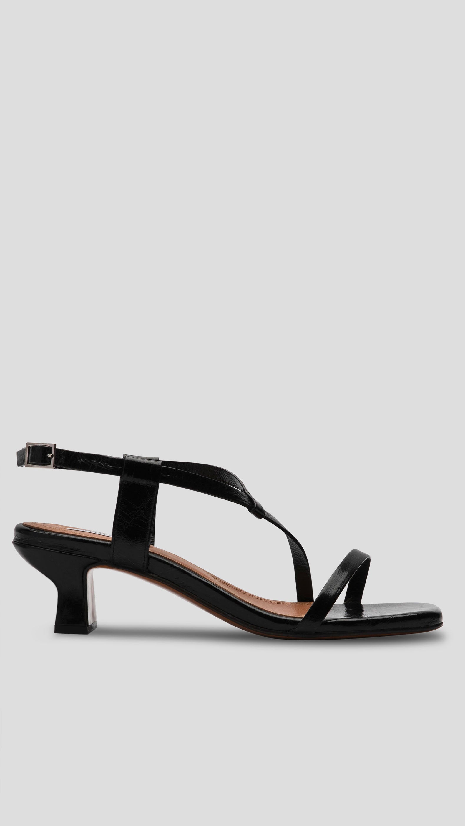 Strappy heeled sandal in black crushed patent leather.