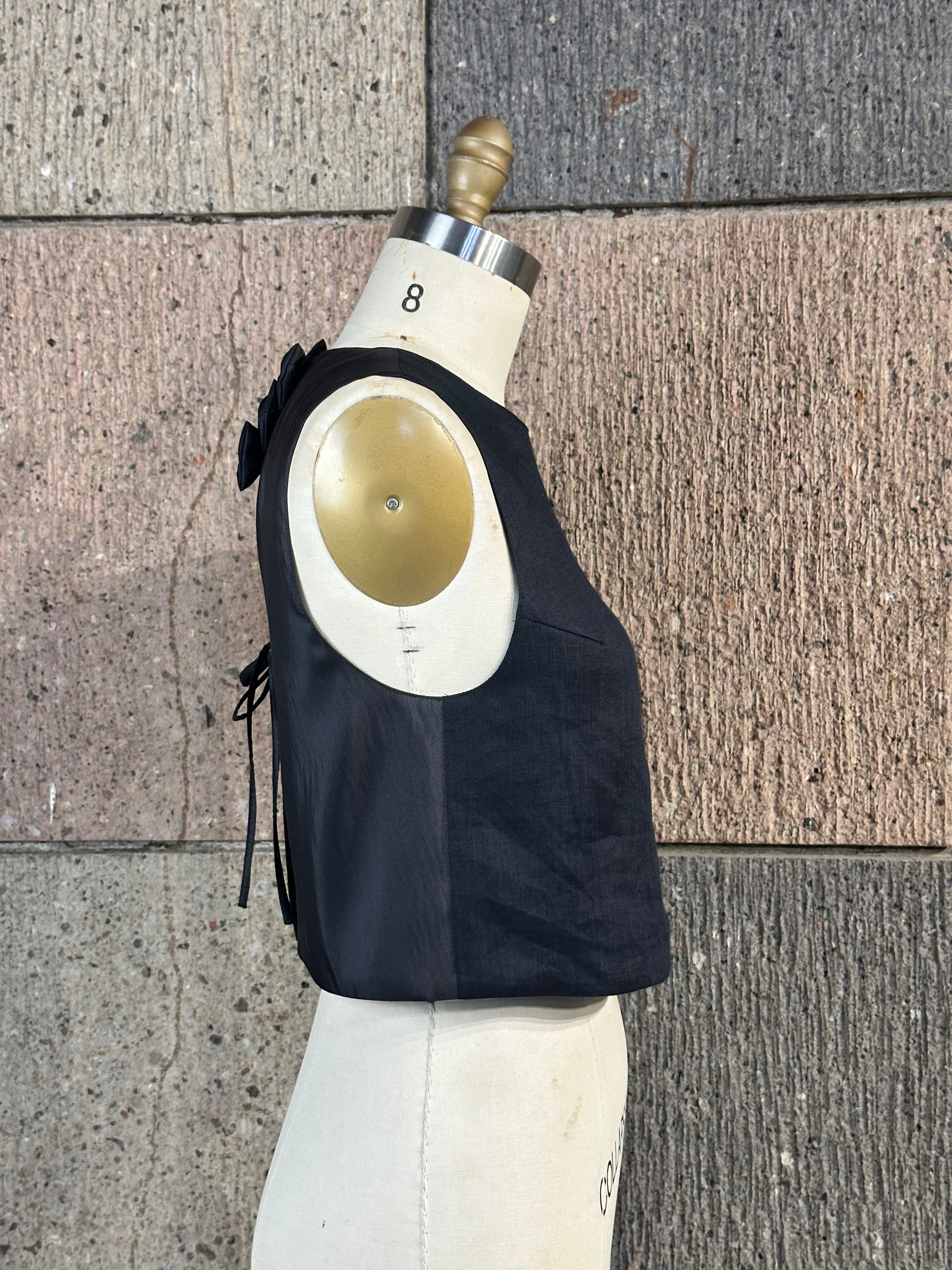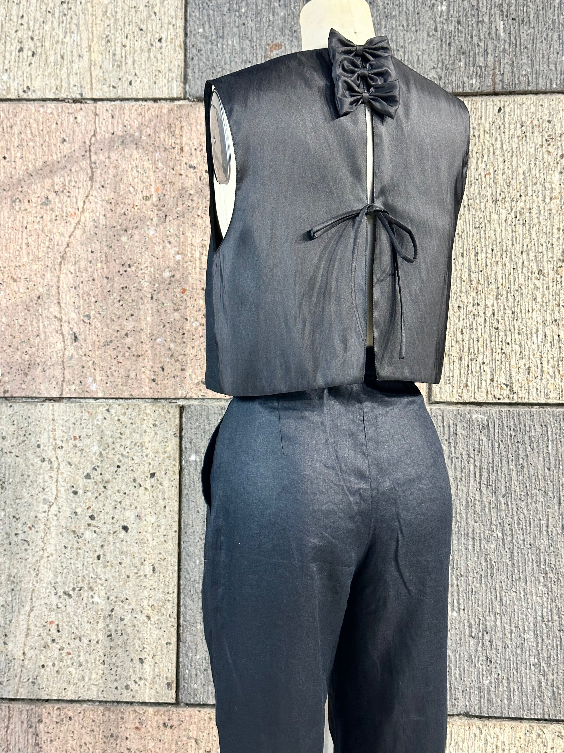 Bow Open Back Top in Black Linen Front, Taffeta Back