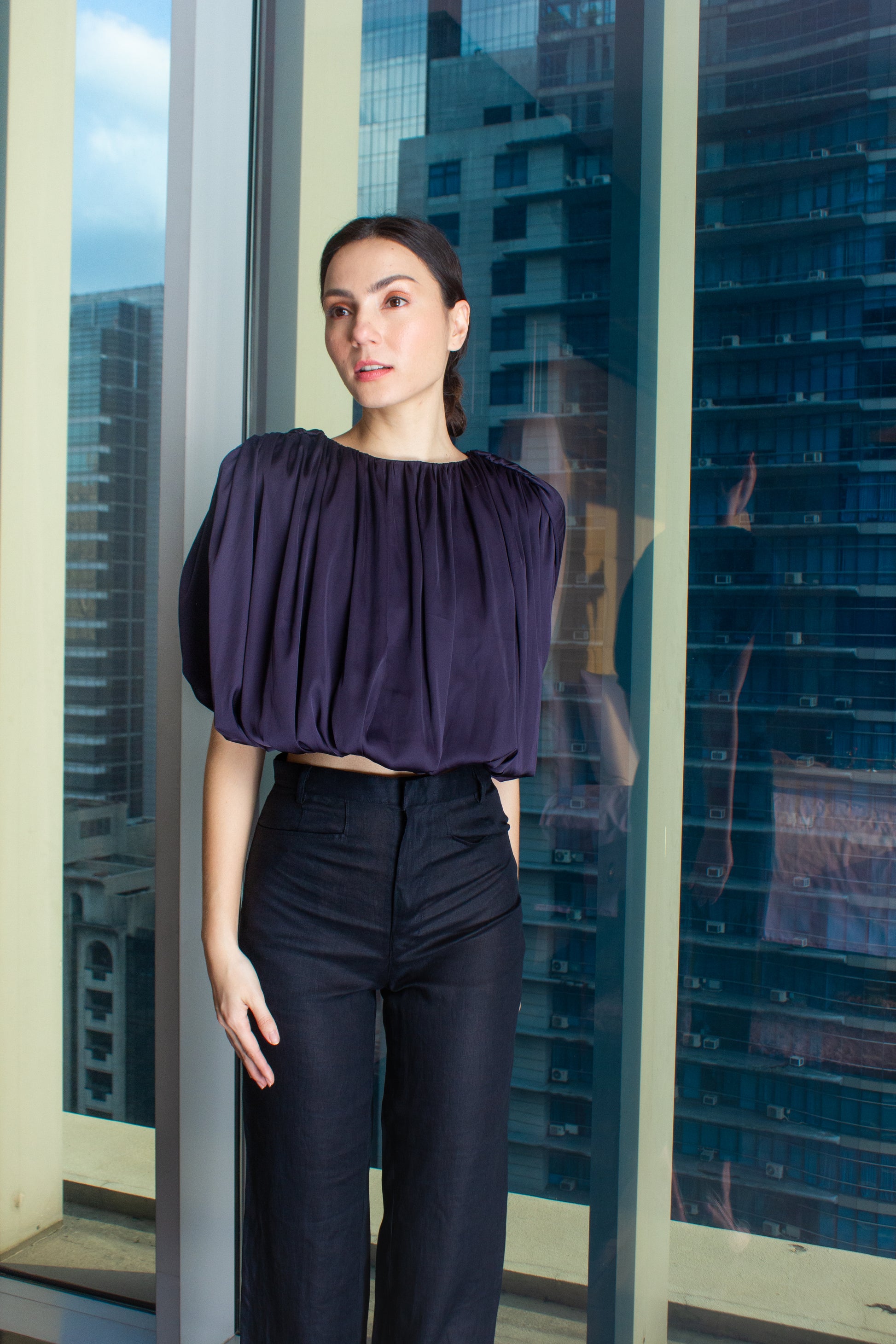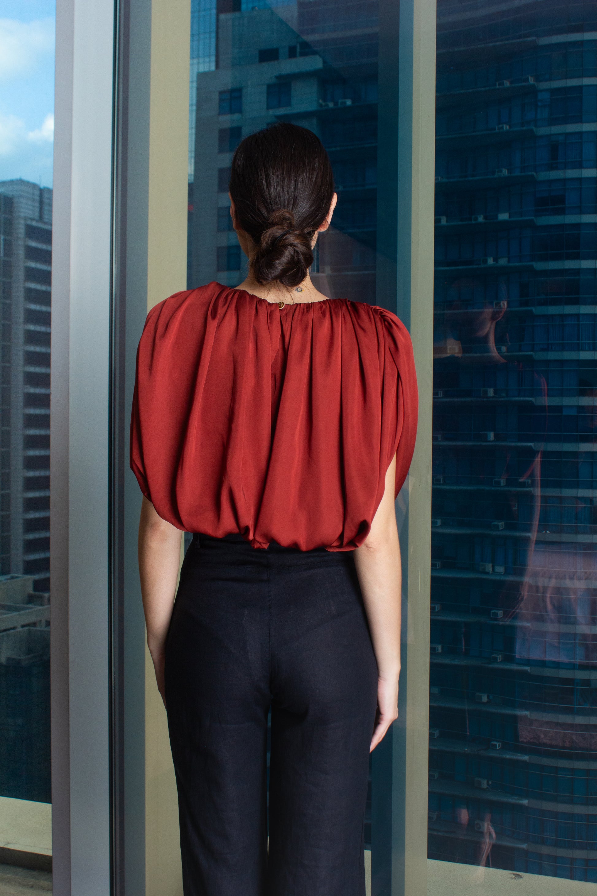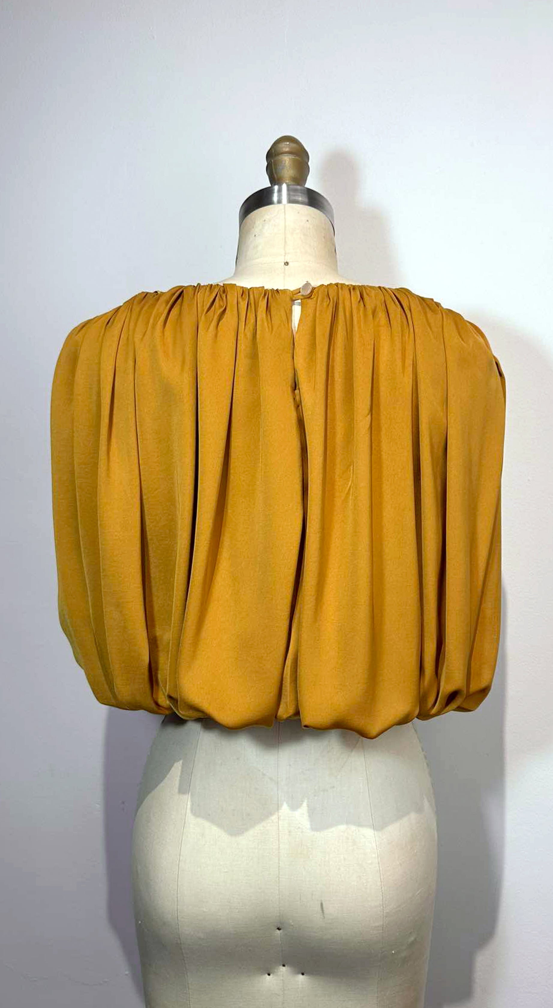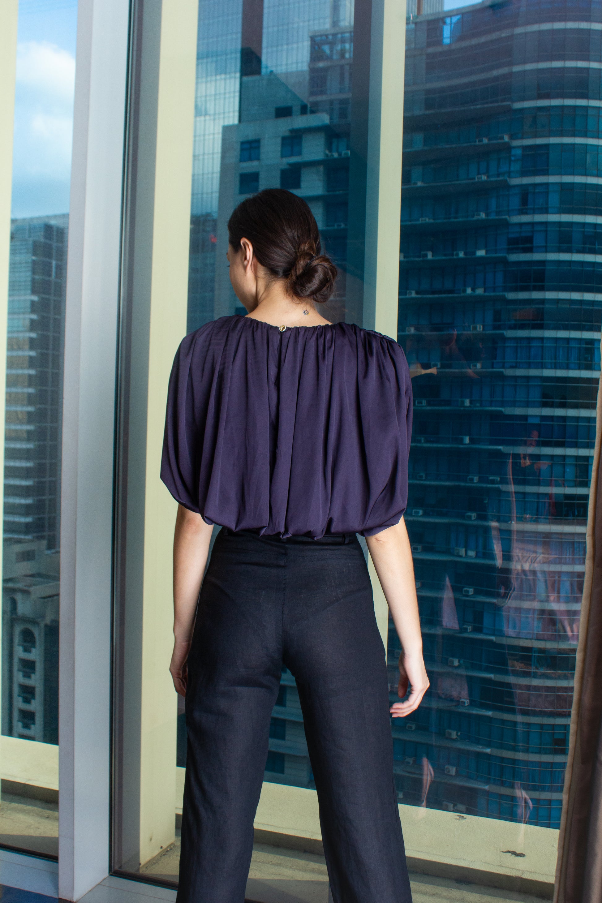Semi-drop shoulder, Slip on top with back single button closure, Lightweight shirred top with an oversized fit from bust to waist