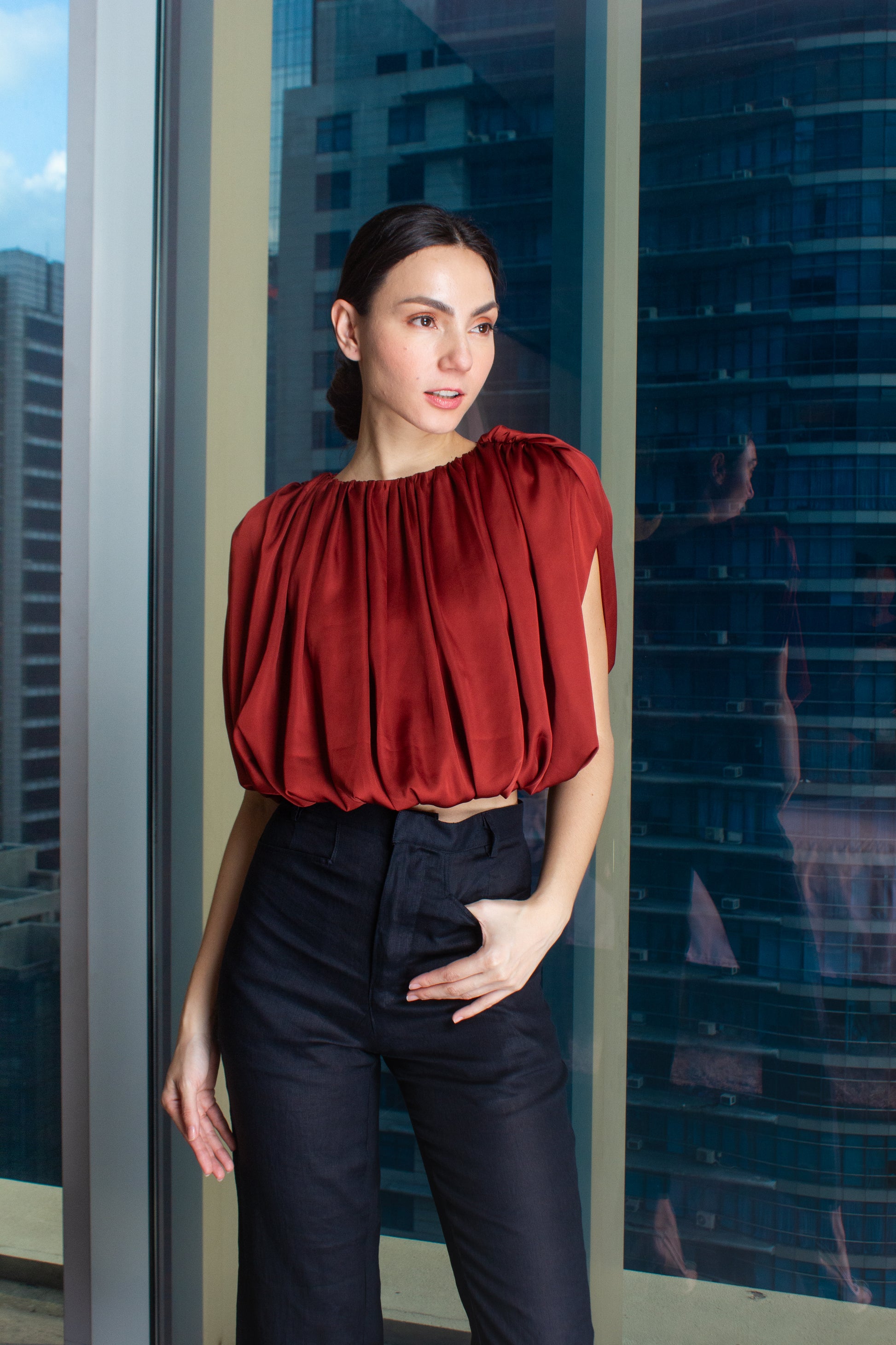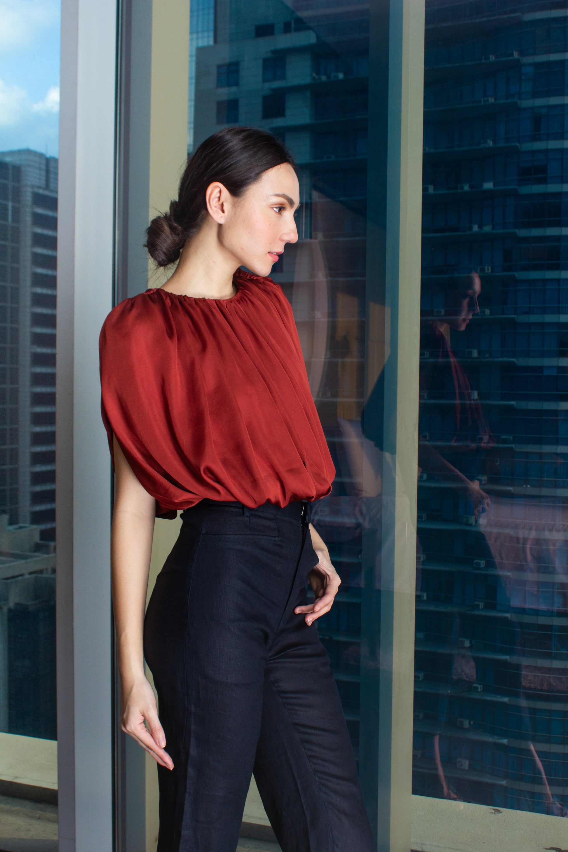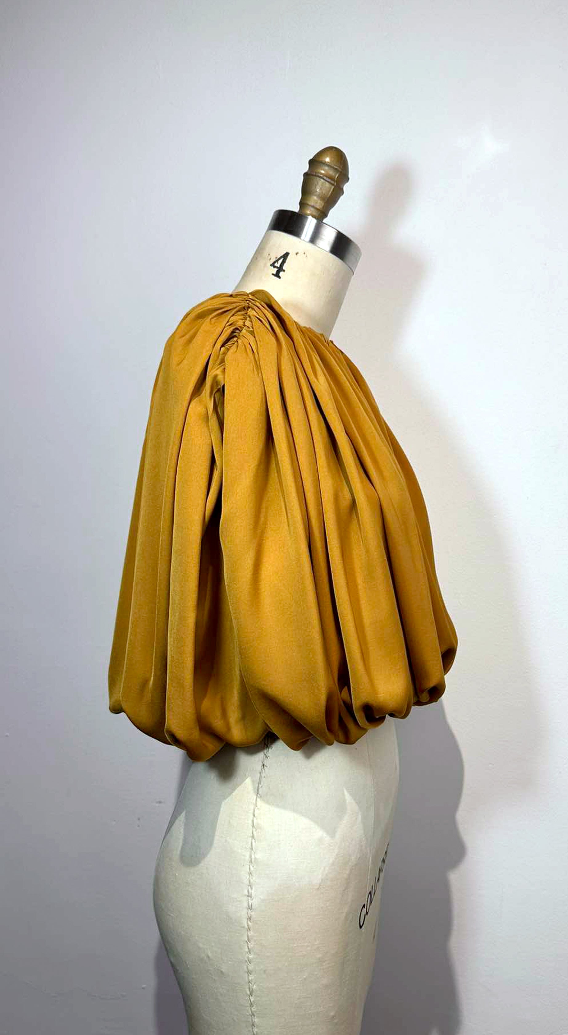 Semi-drop shoulder, Slip on top with back single button closure, Lightweight shirred top with an oversized fit from bust to waist