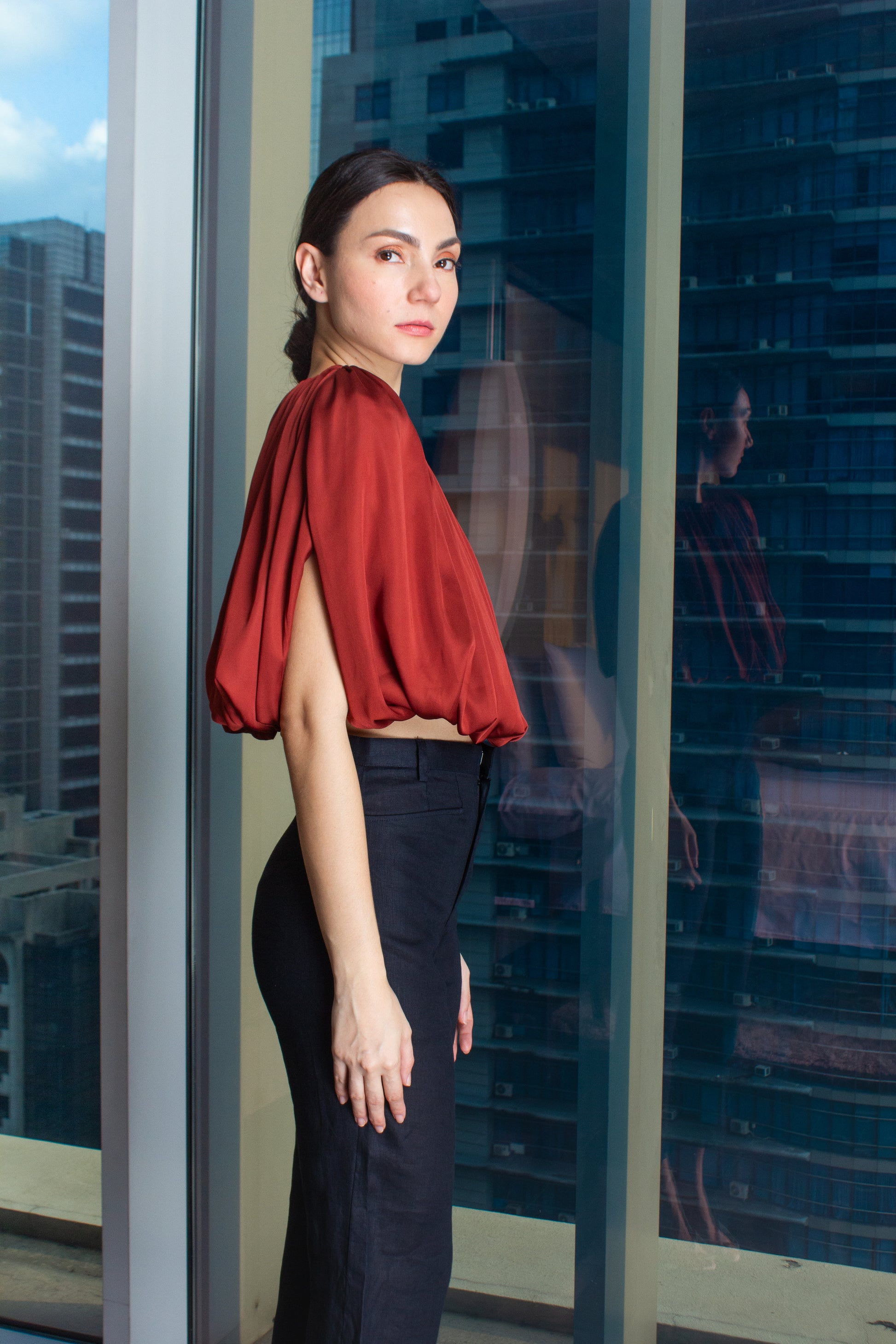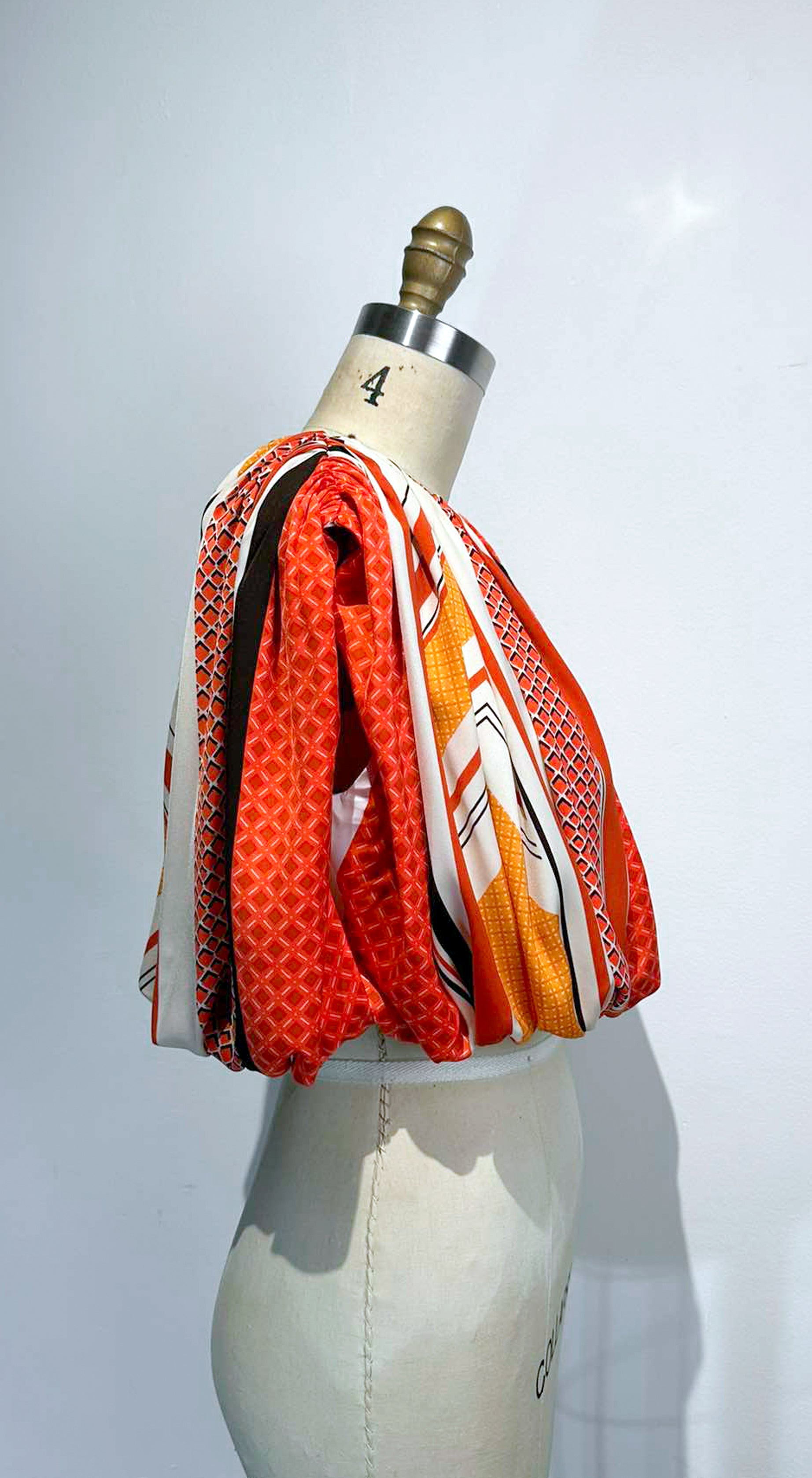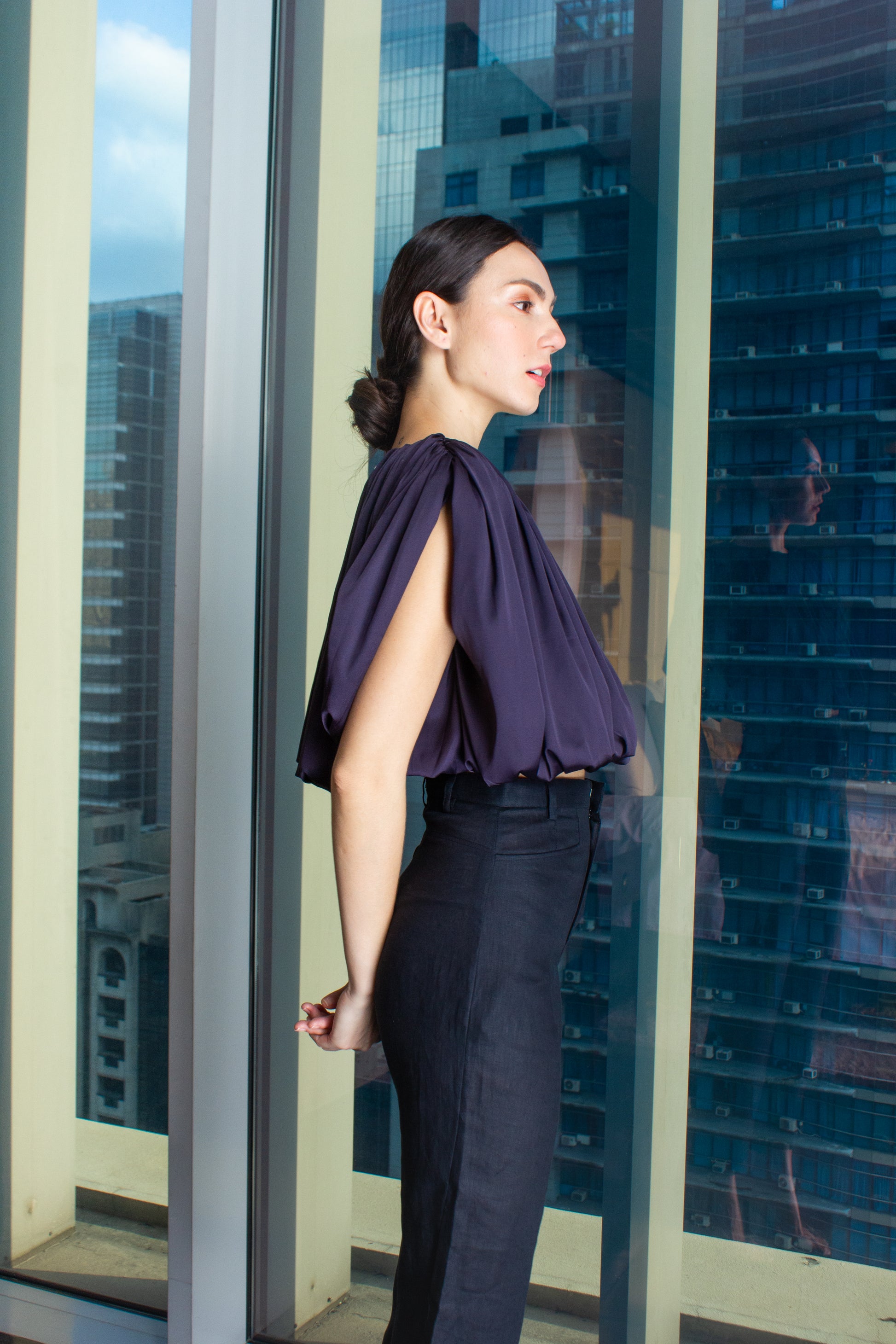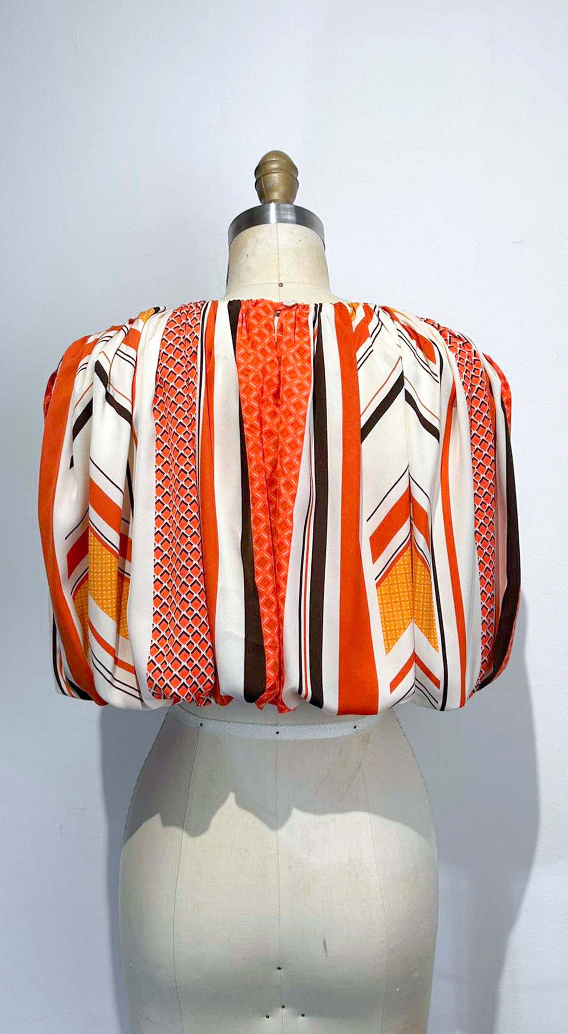 Semi-drop shoulder, Slip on top with back single button closure, Lightweight shirred top with an oversized fit from bust to waist