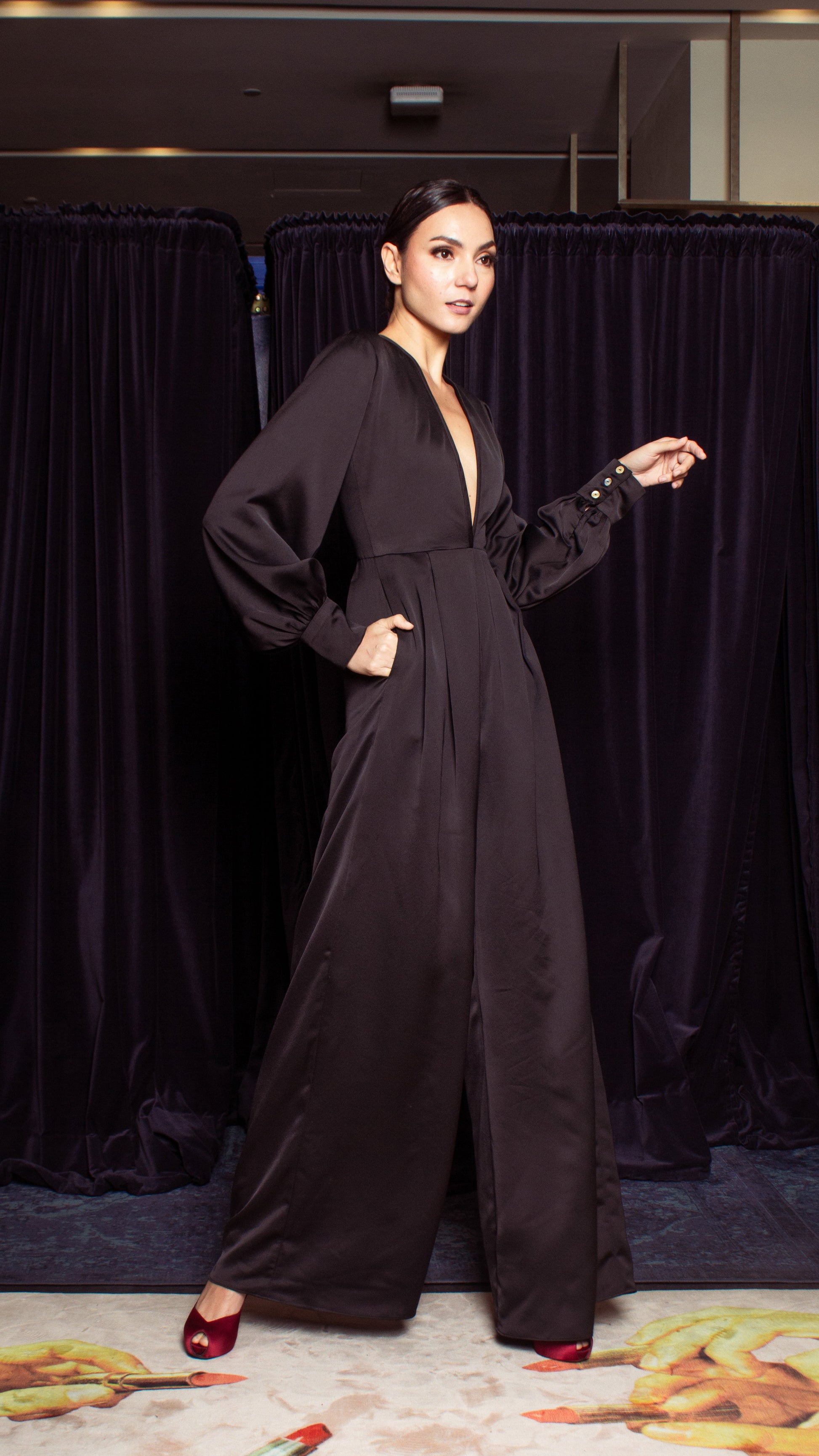 Deep V-Neck Front Pleat Wide Leg Jumpsuit - Black Crepe