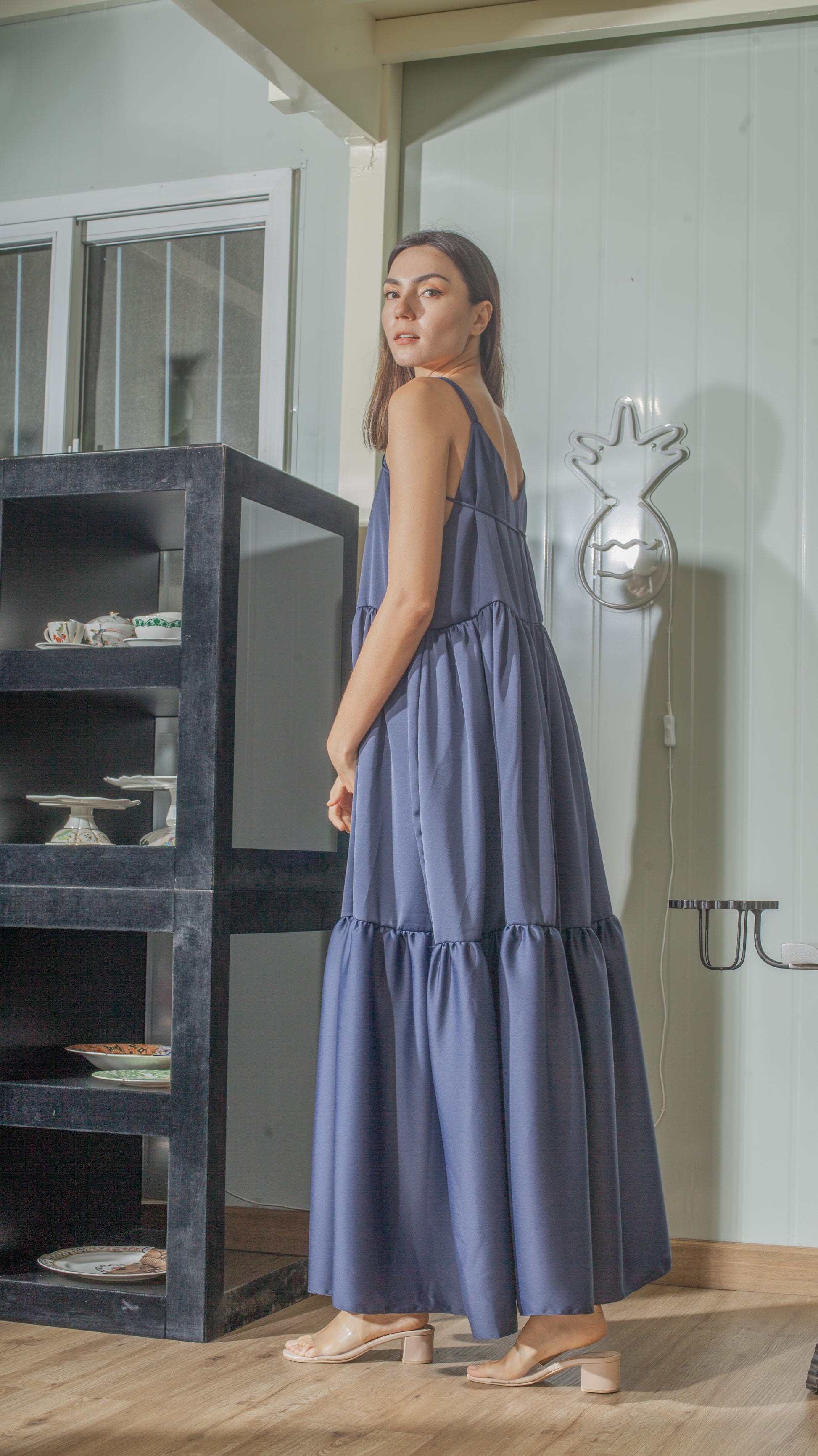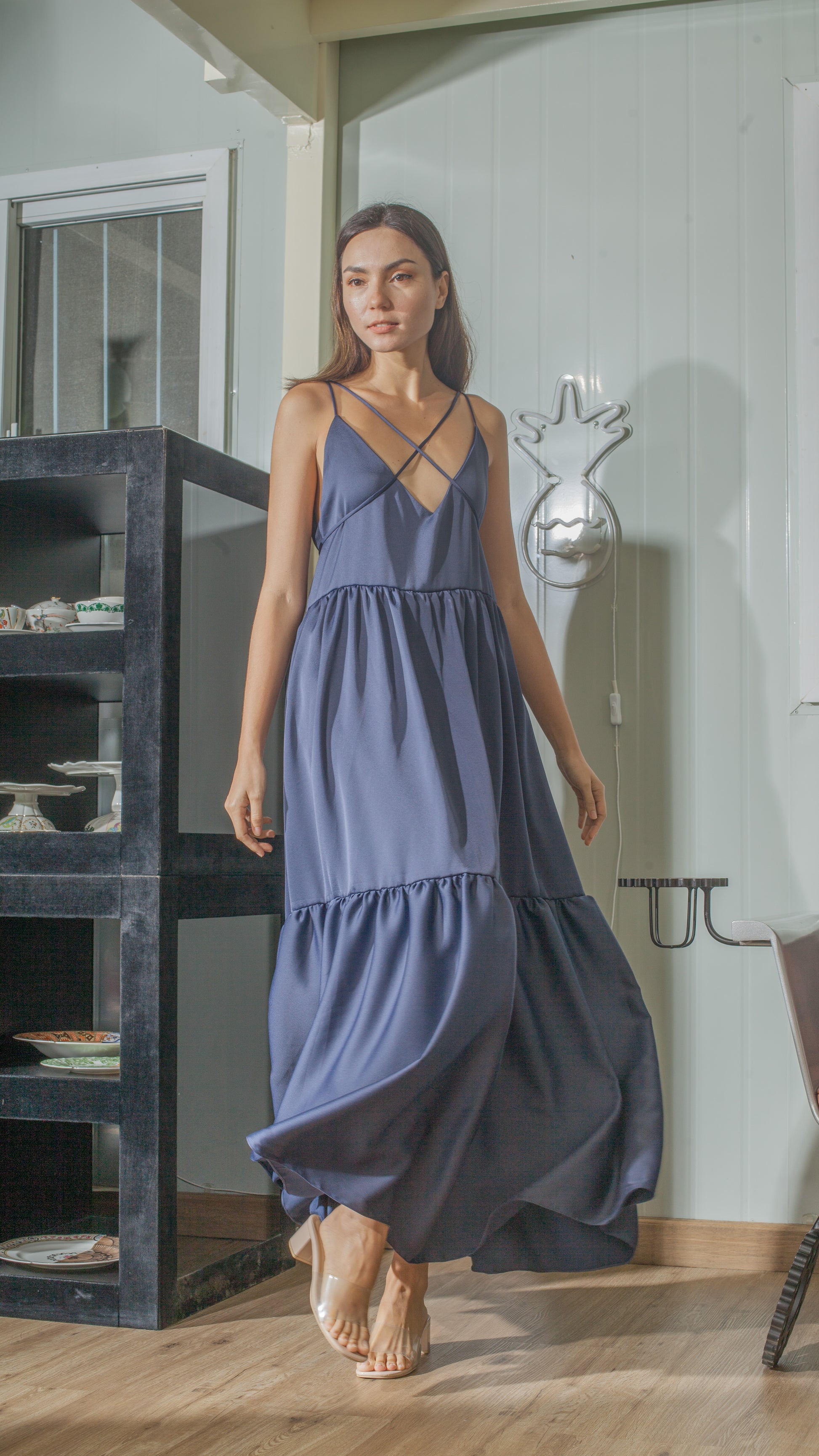 Double Strap V-Neckline Long Dress in Blue Crepe