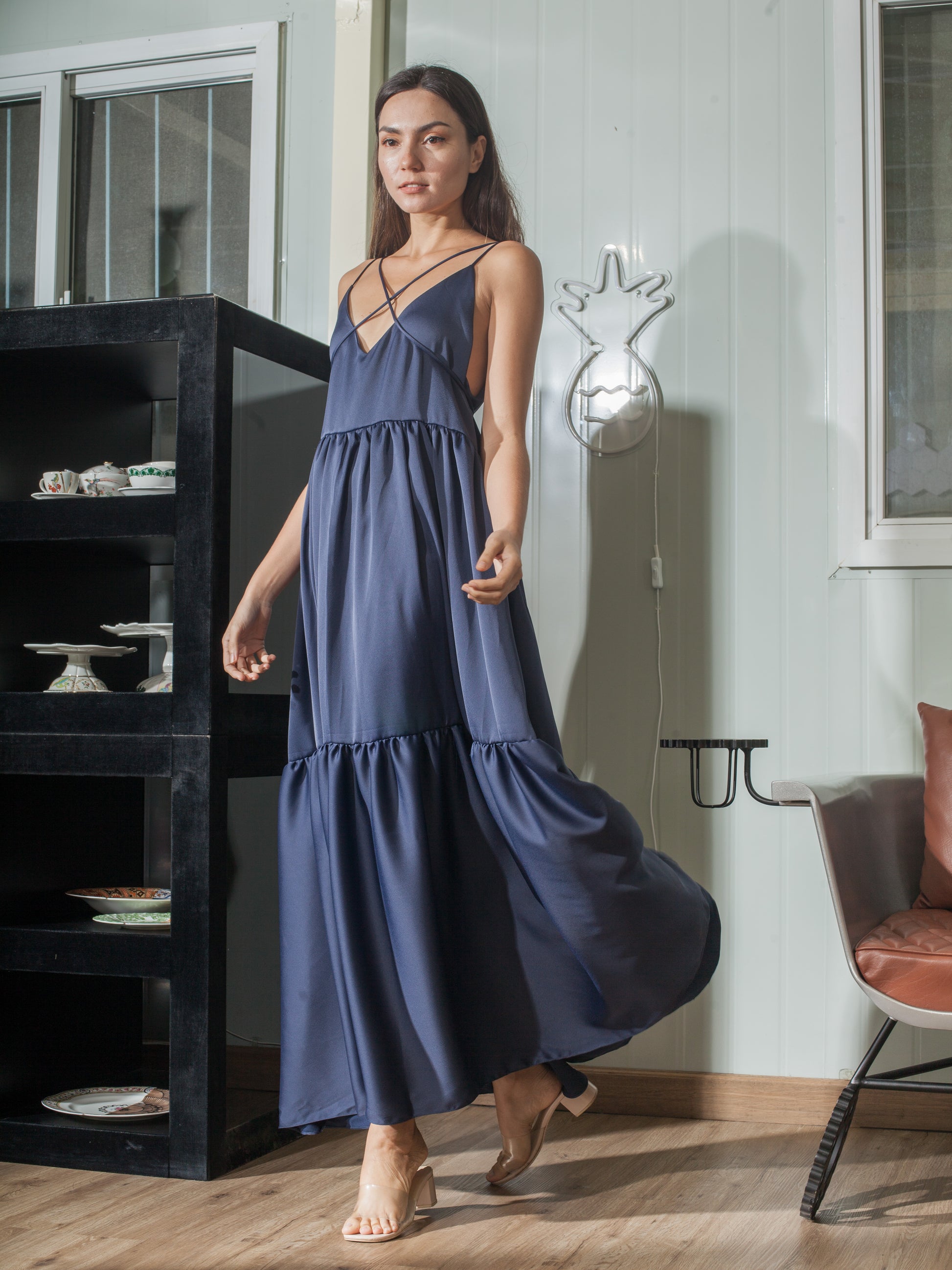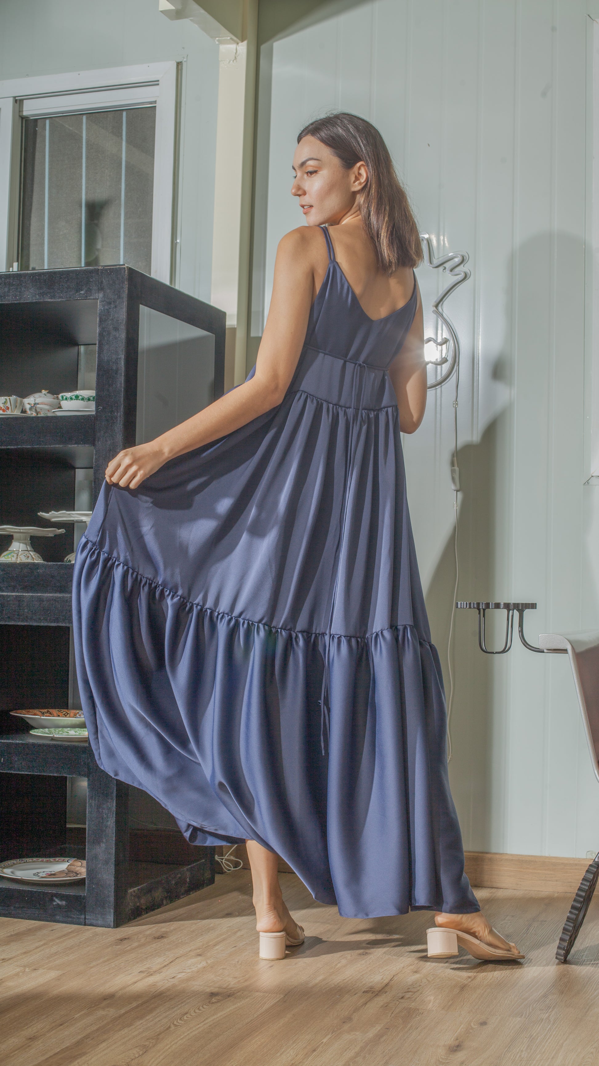 Double spaghetti strap with one you can use to style the dress, reversible with back worn as front for a sexier v-neckline, shirred hem floor length dress, voluminous skirt, without zipper and button closure