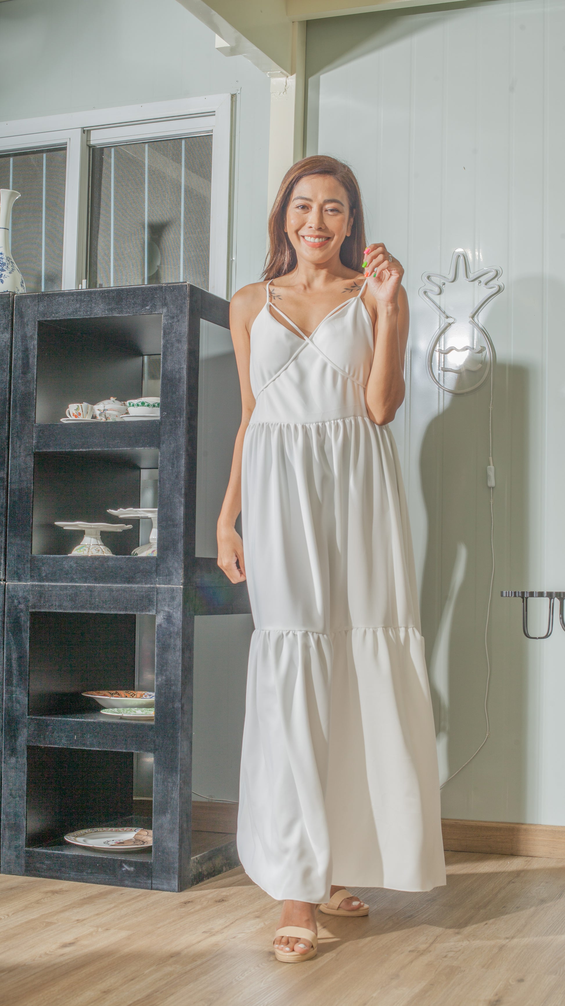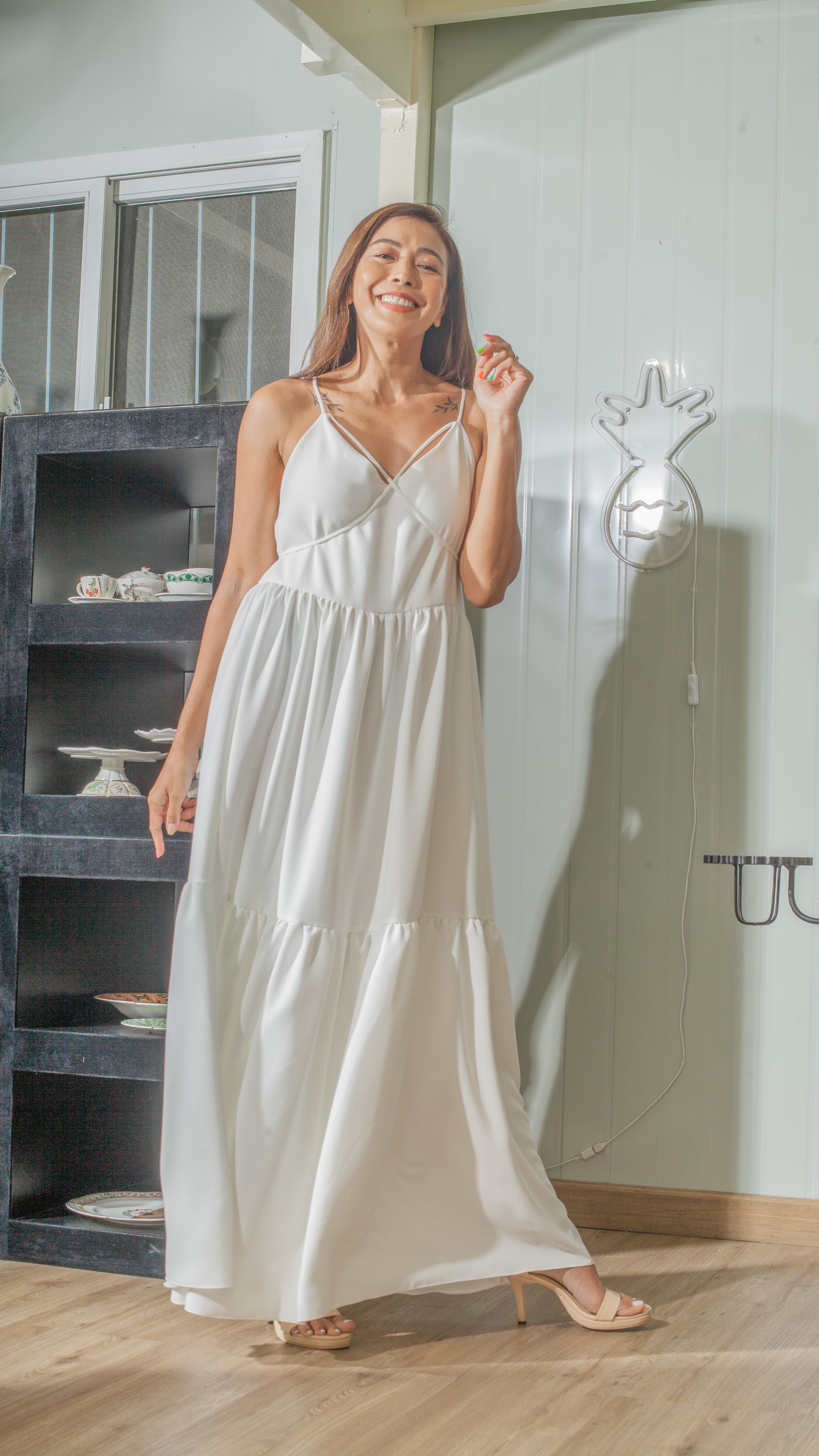 Double spaghetti strap with one you can use to style the dress, reversible with back worn as front for a sexier v-neckline, shirred hem floor length dress, voluminous skirt, without zipper and button closure