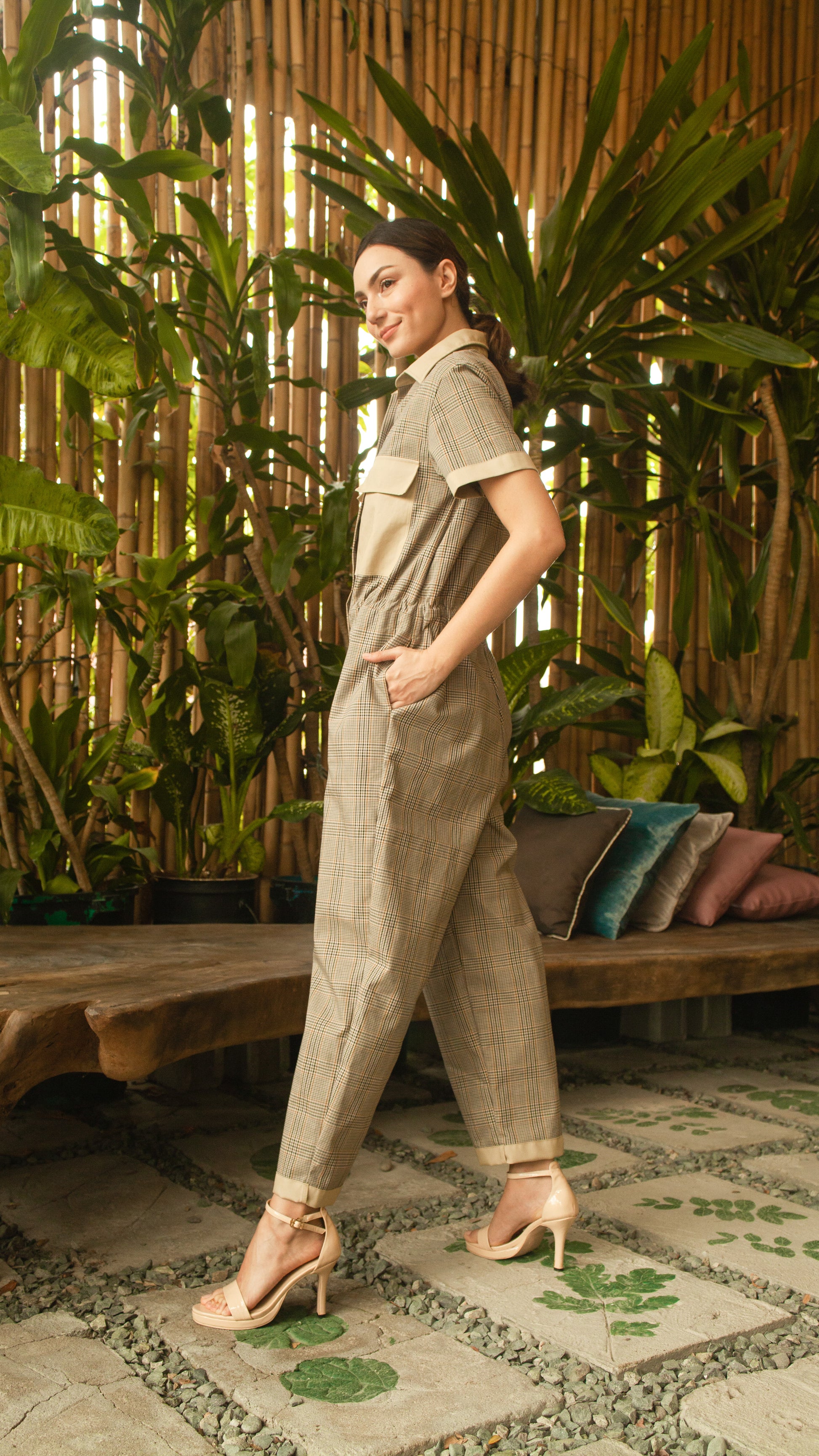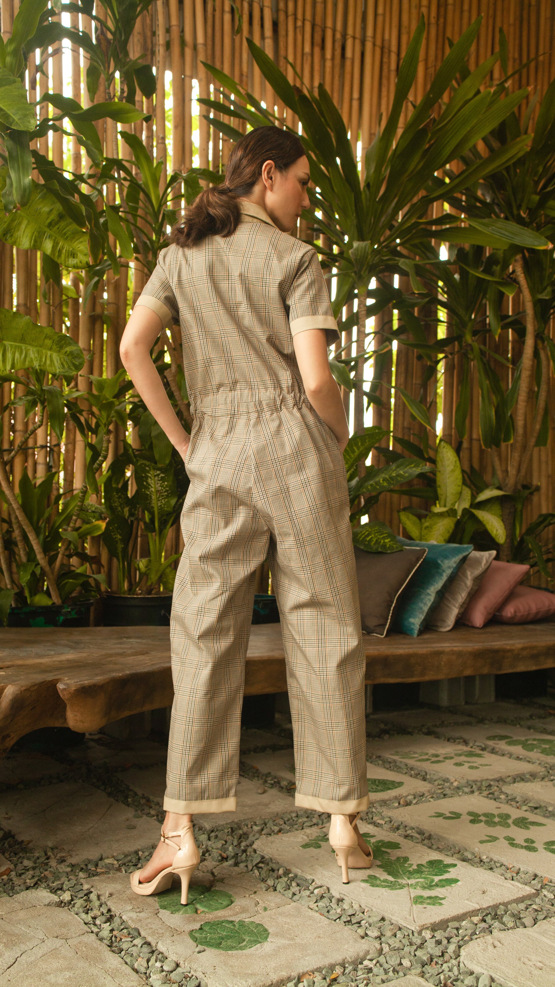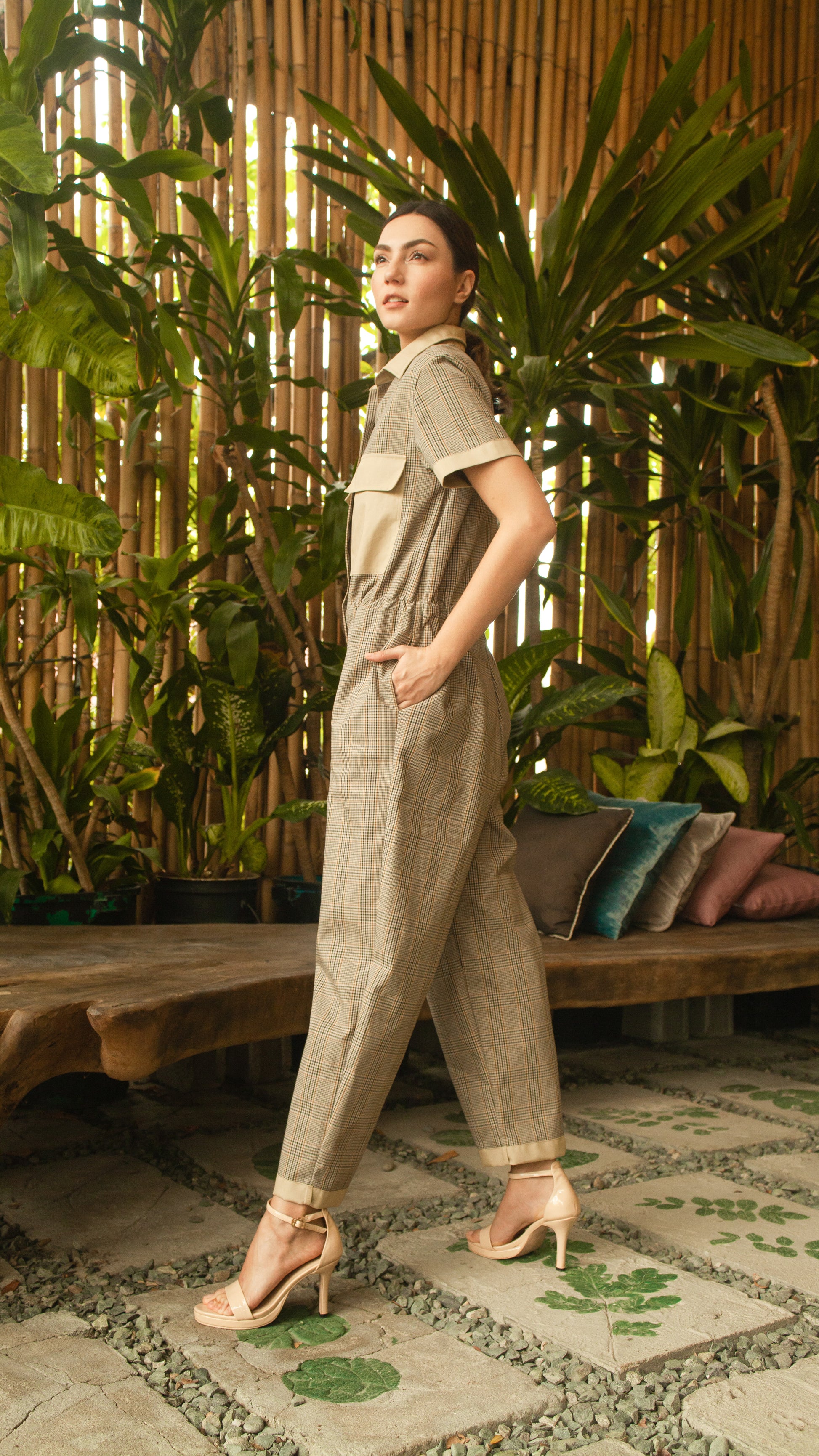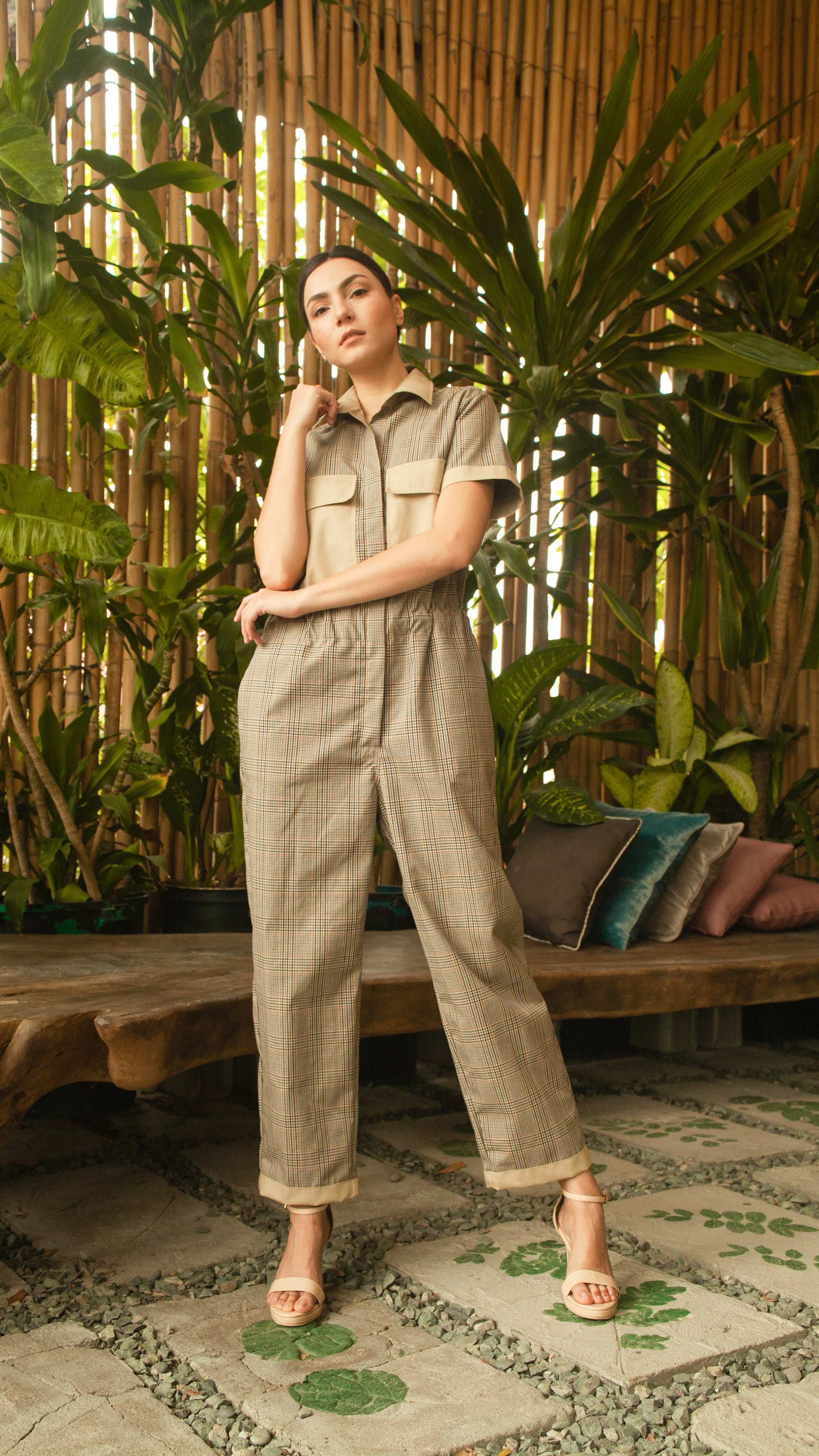Elastic Waist Oversized Short Sleeve Baggy Jumpsuit — Checkered / Khaki