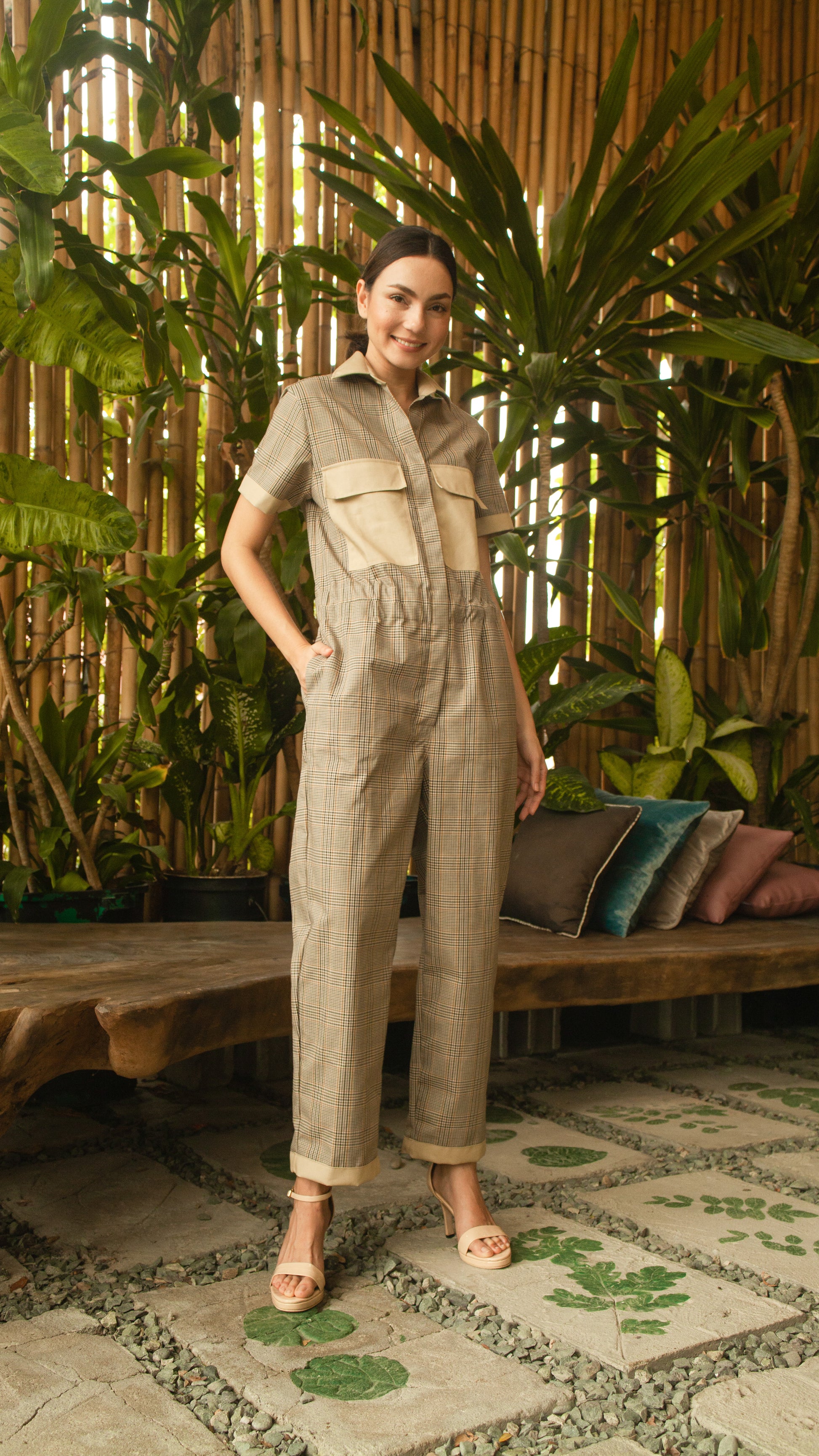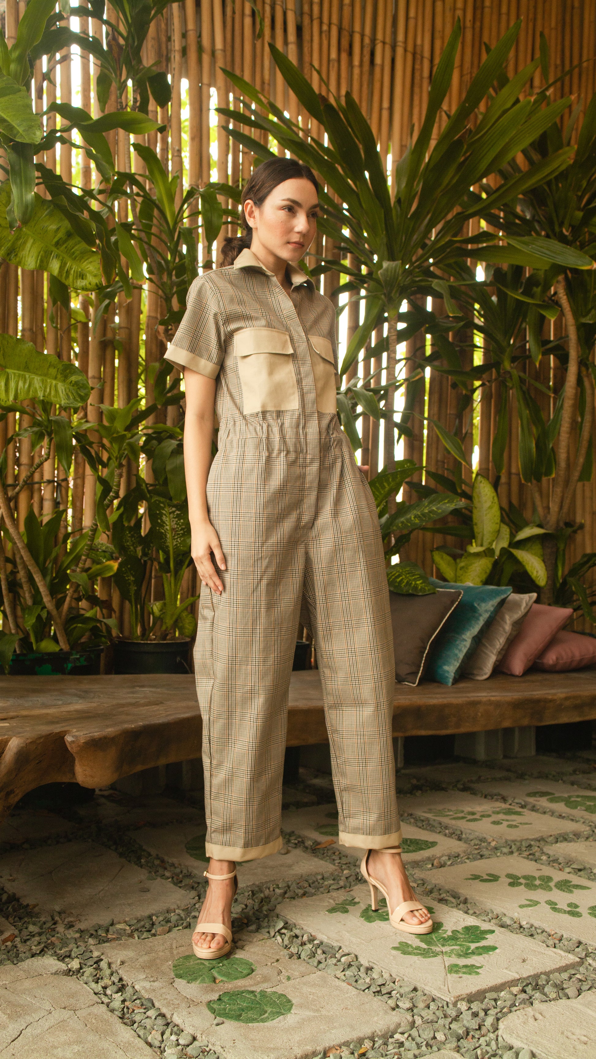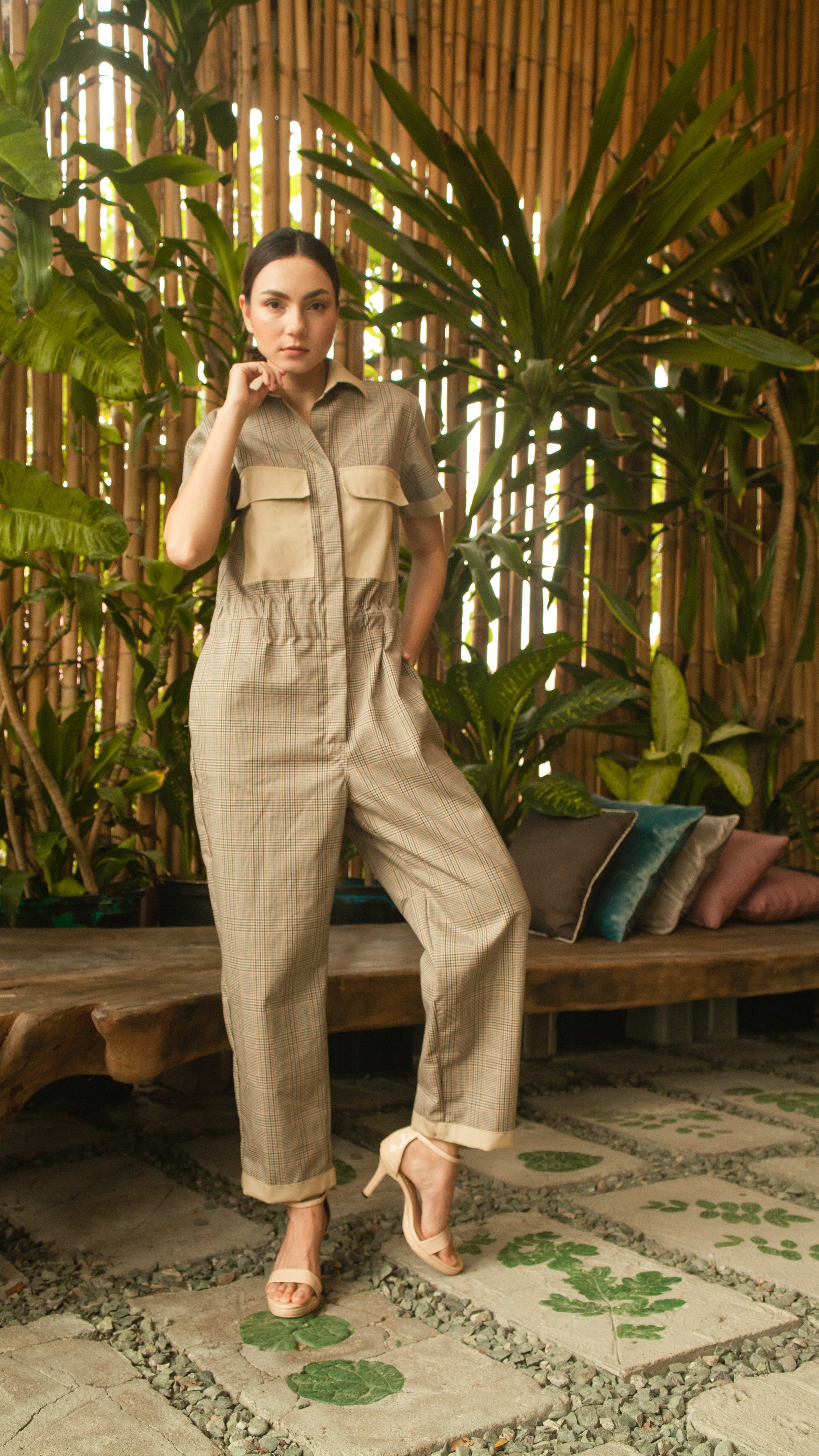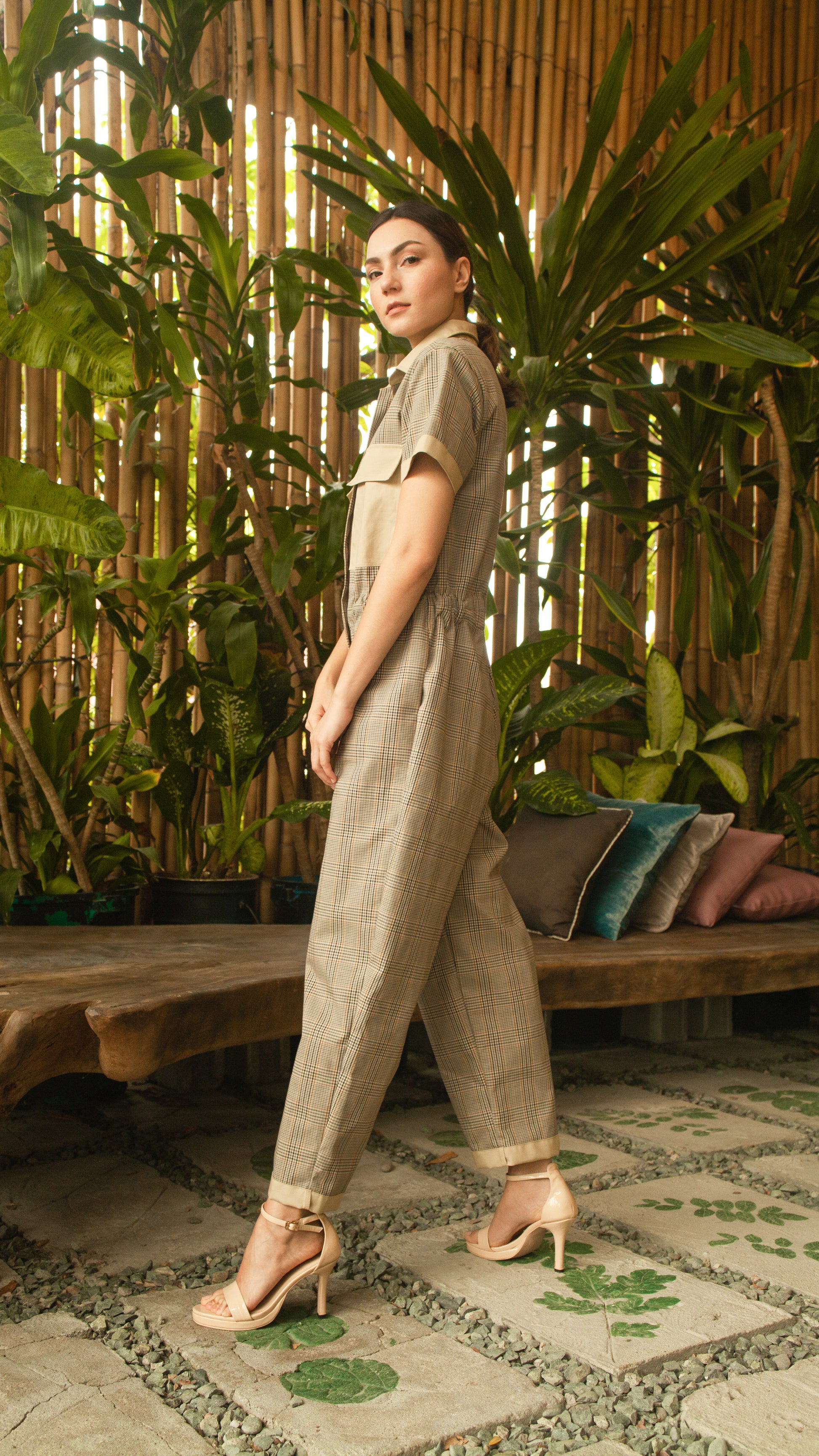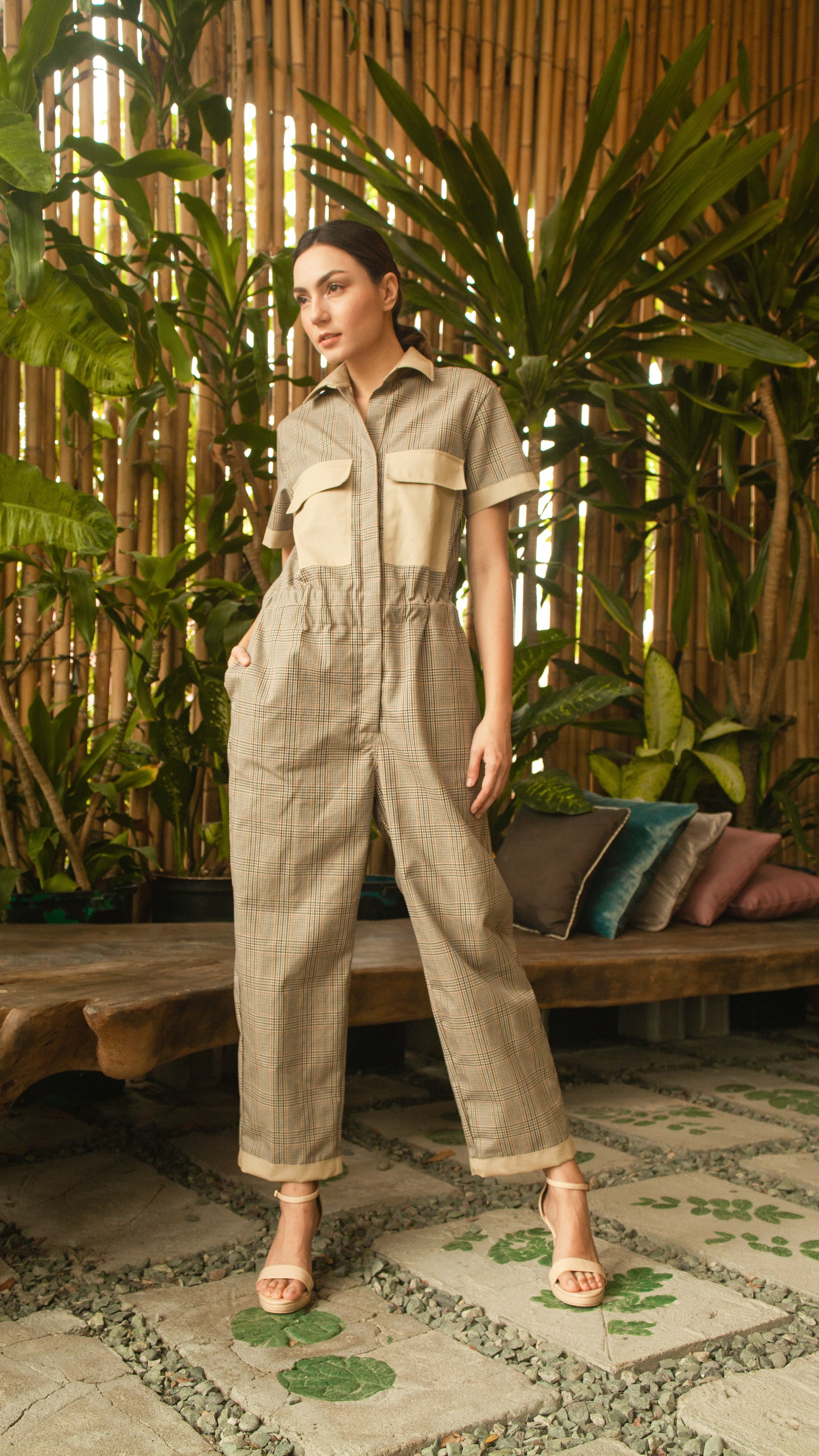 Elastic Waist Oversized Short Sleeve Baggy Jumpsuit — Checkered / Khaki
