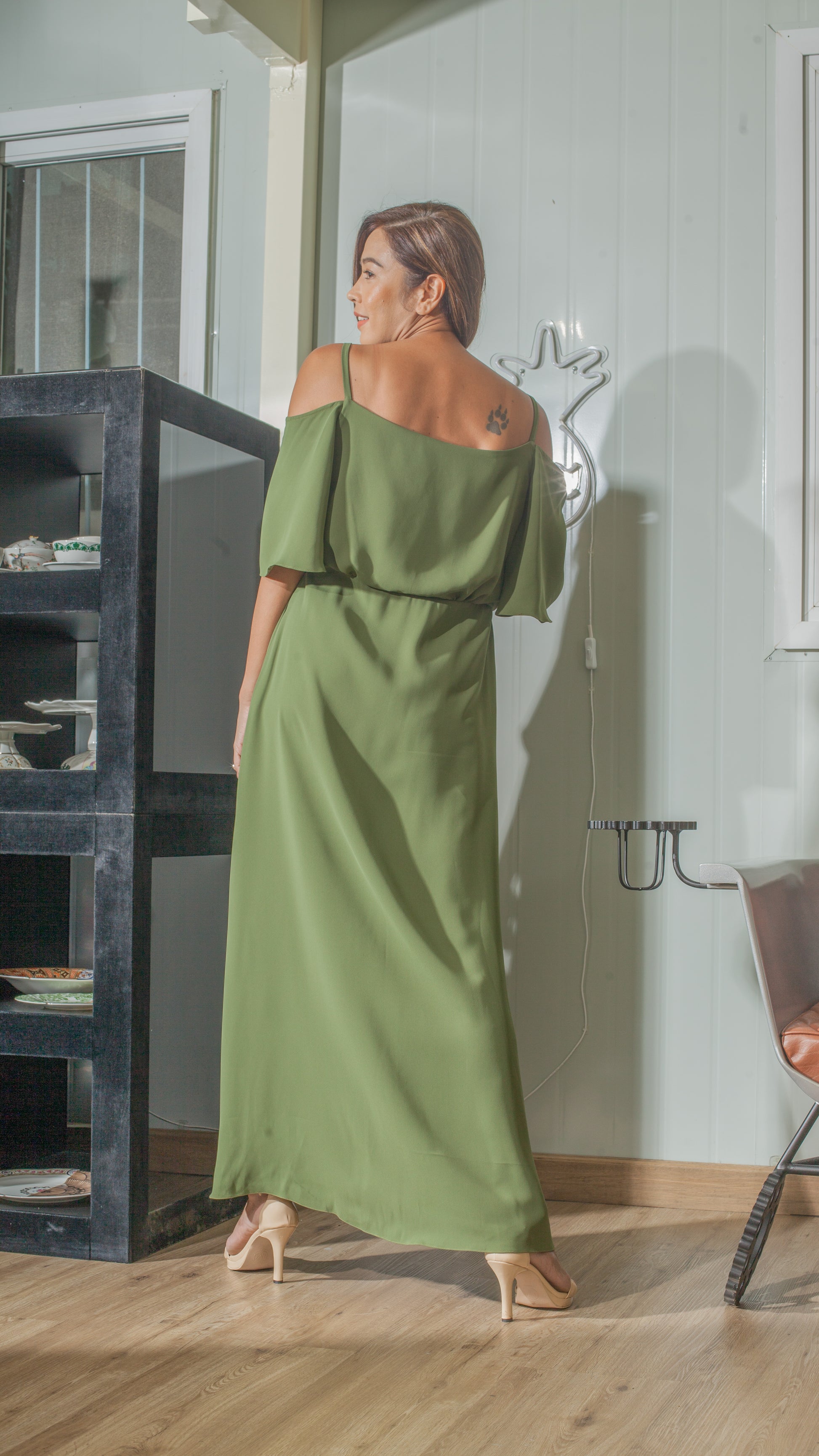 Flounce Cutout Sleeve Double Slit Front Dress in Fatigue Green Crepe
