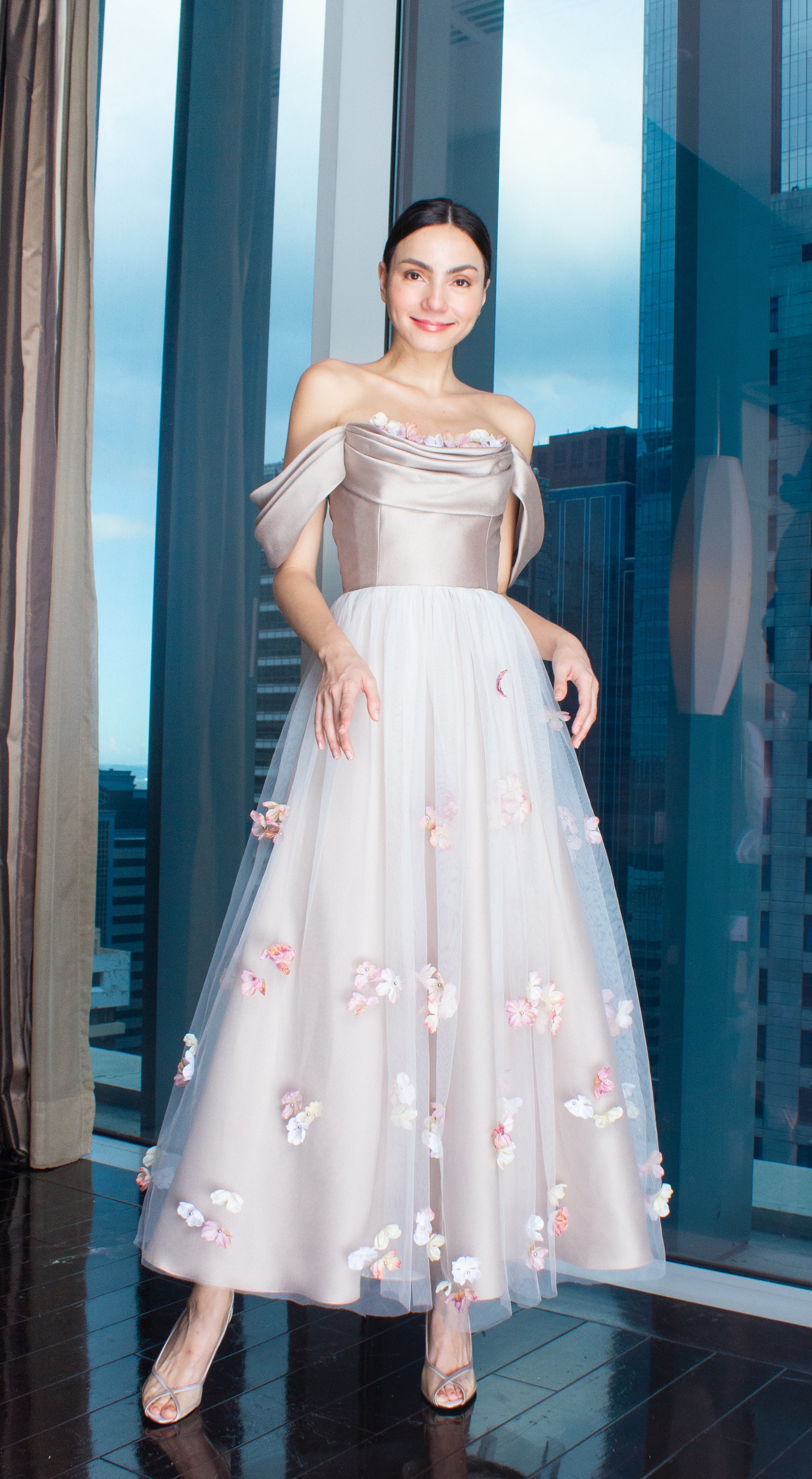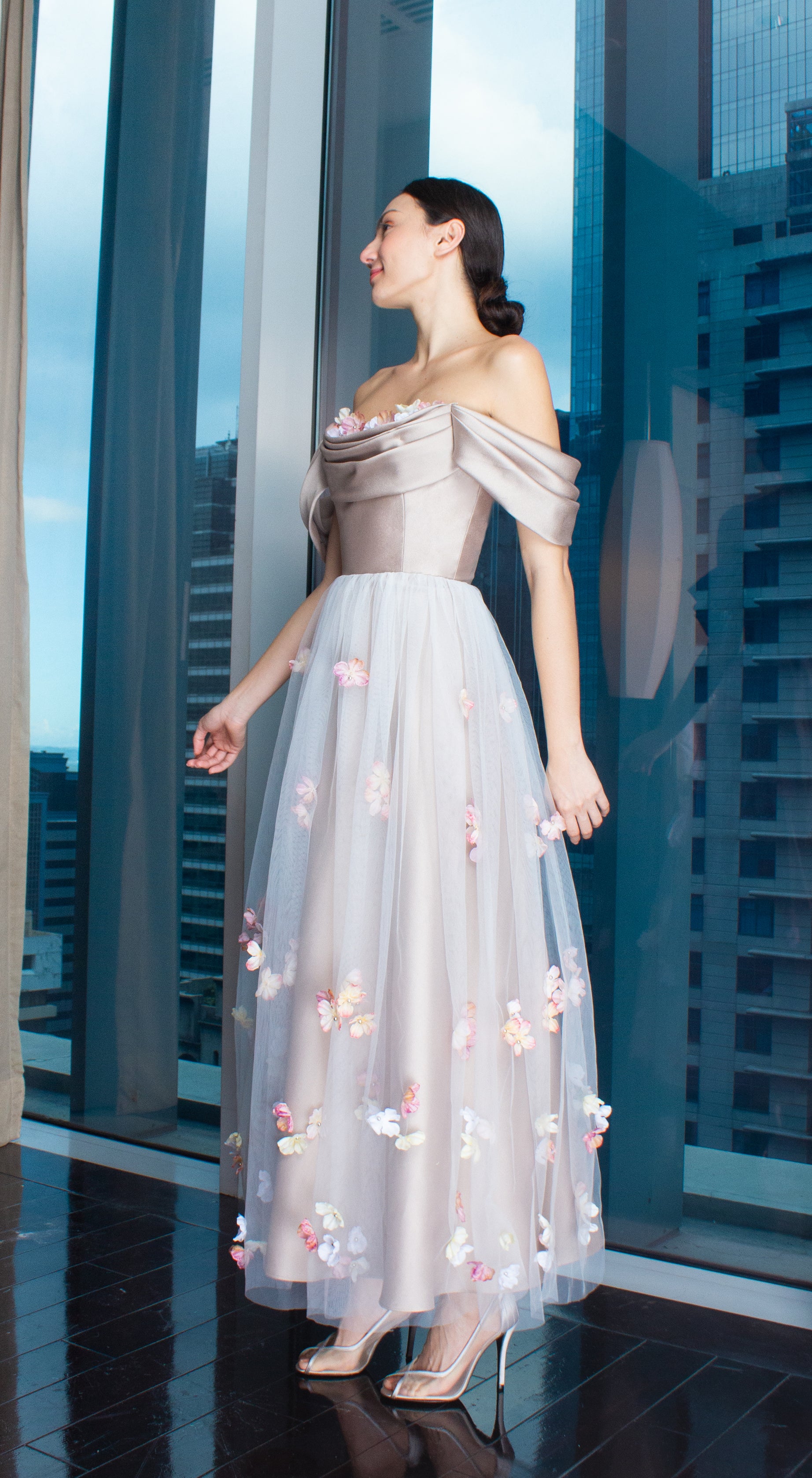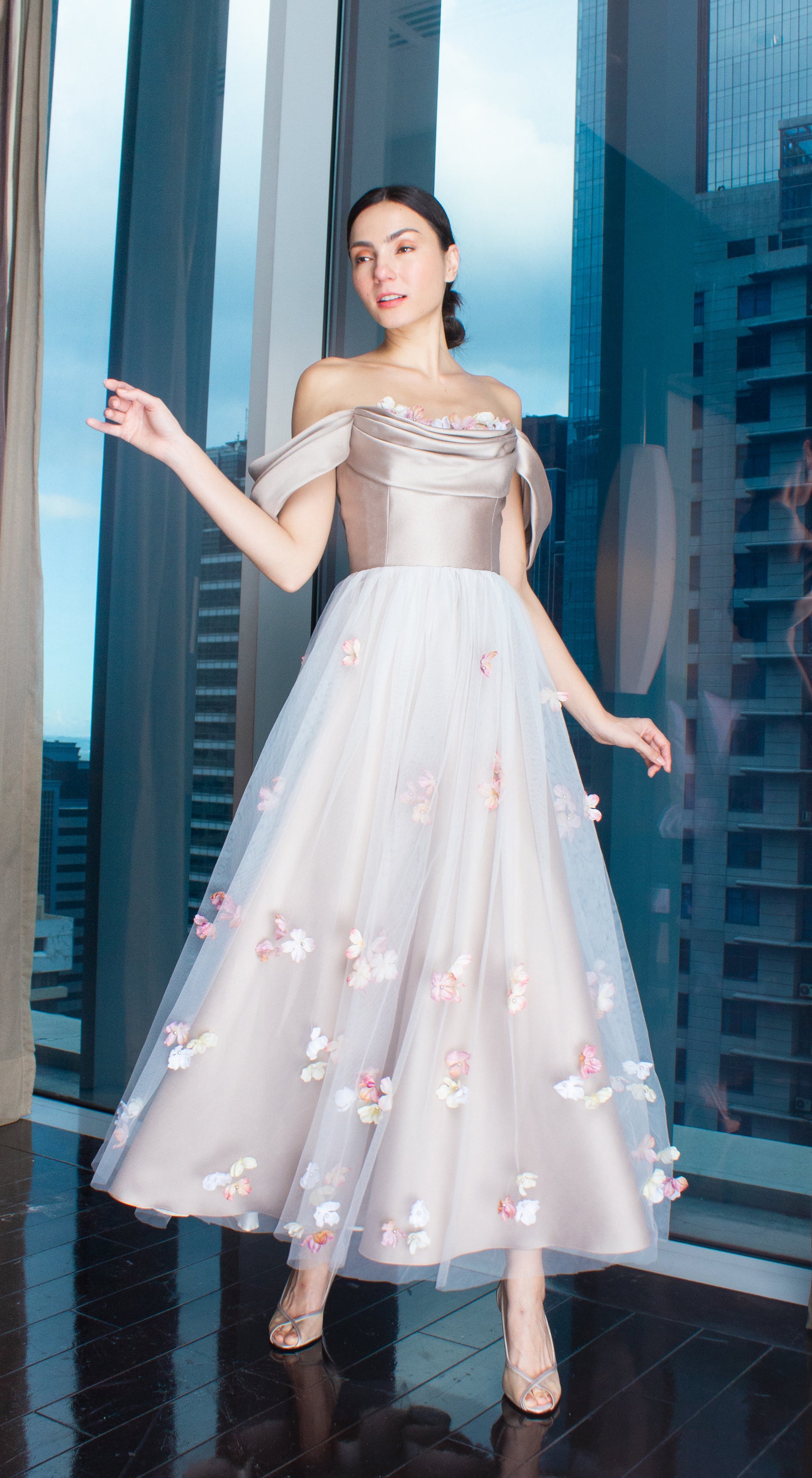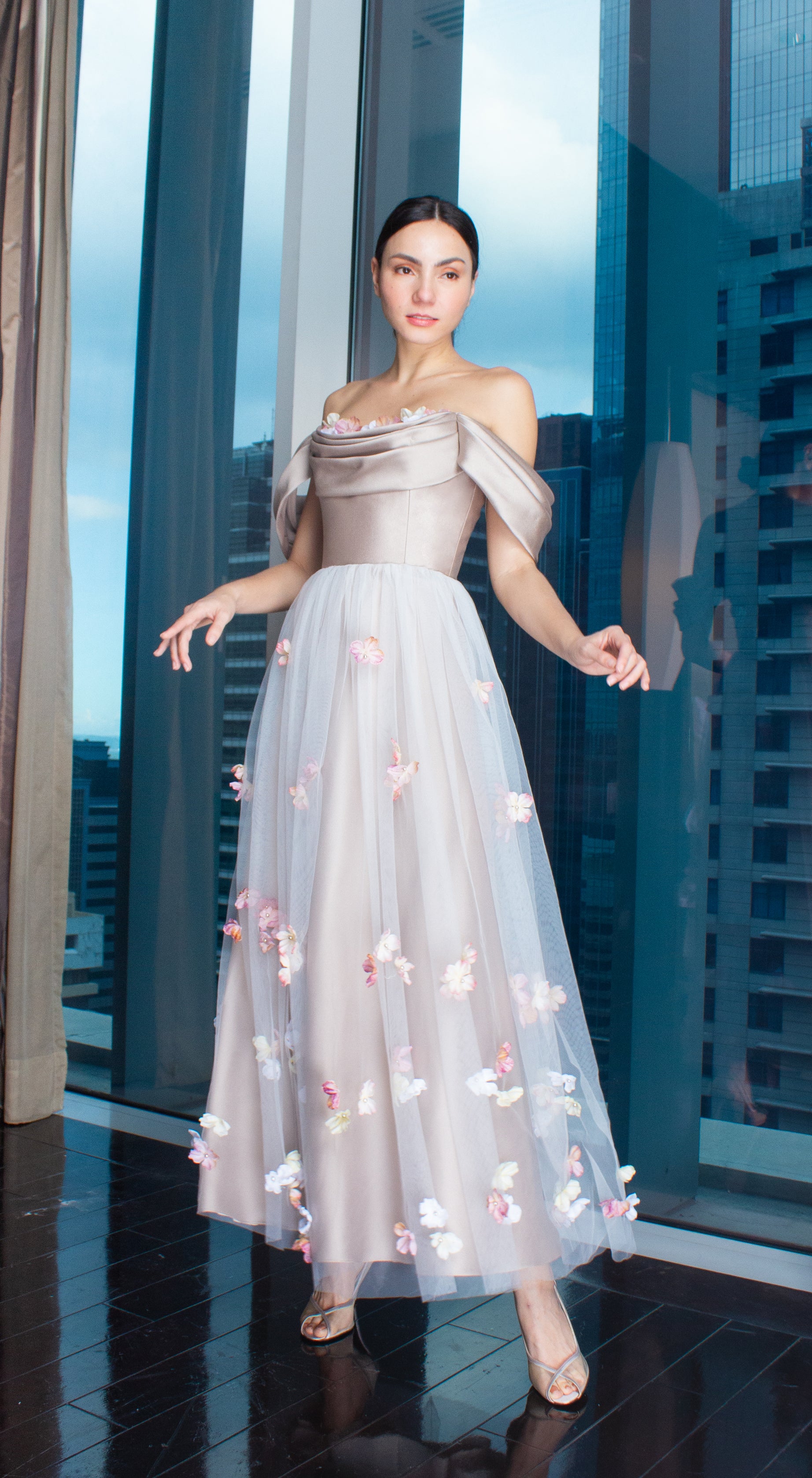 Gold Gazar Off-Shoulder Floral Full Length Gown