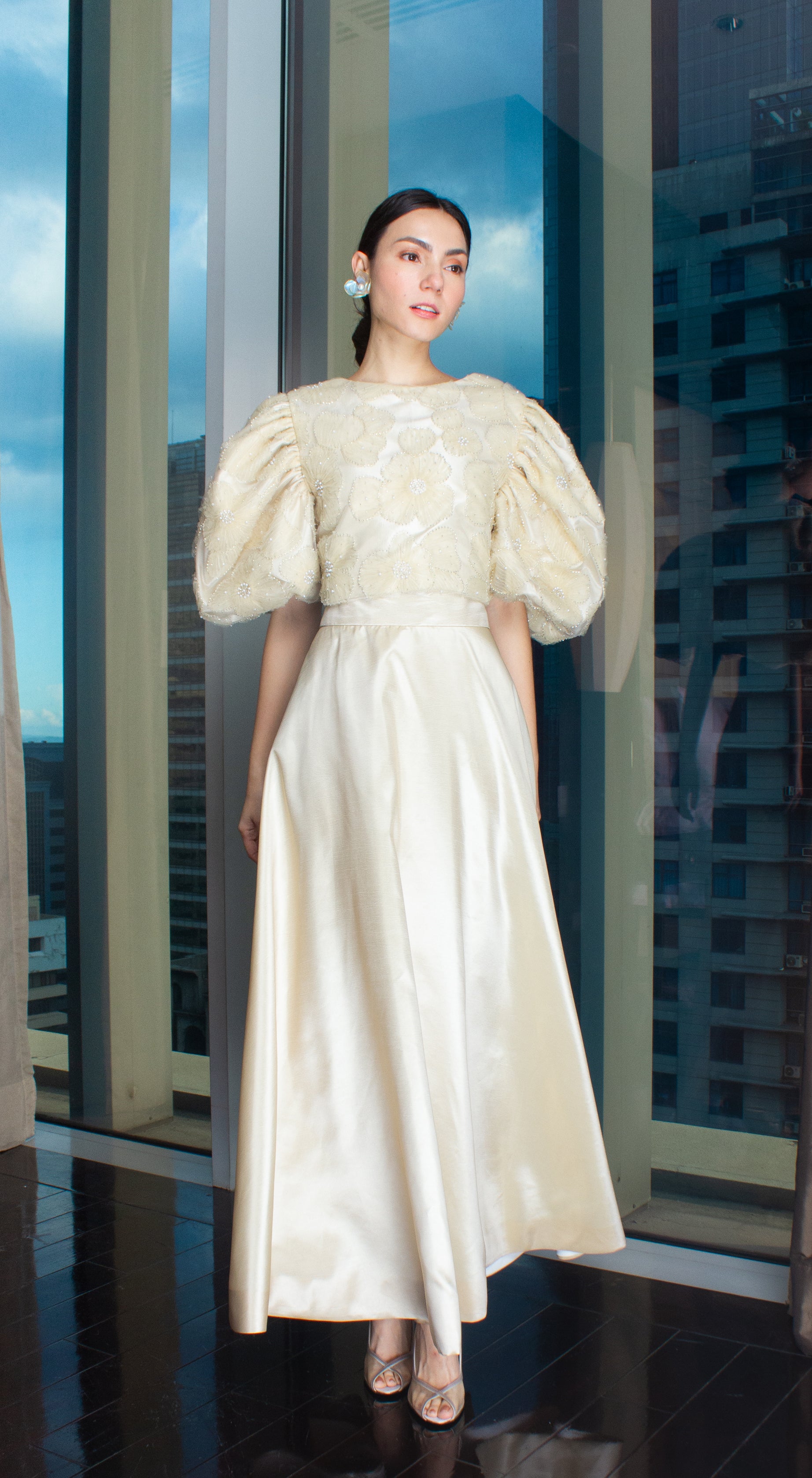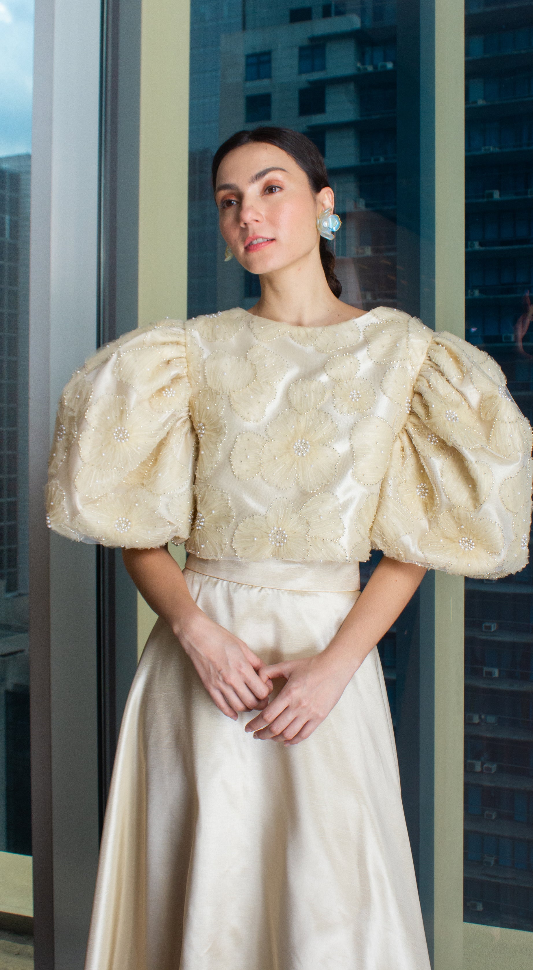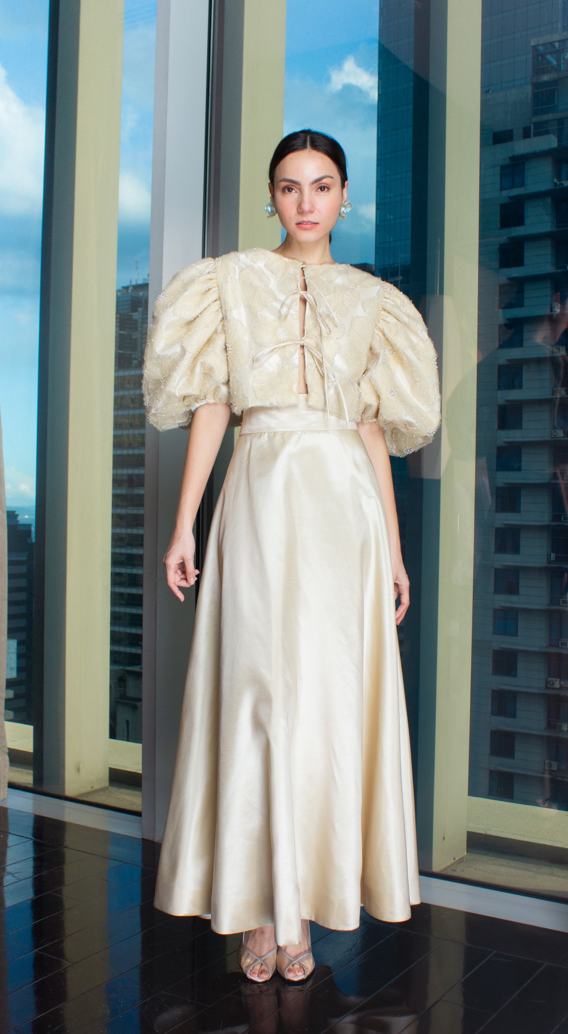 Light Gold Taffeta Beige Lace Puff-Sleeve Open Back Top
