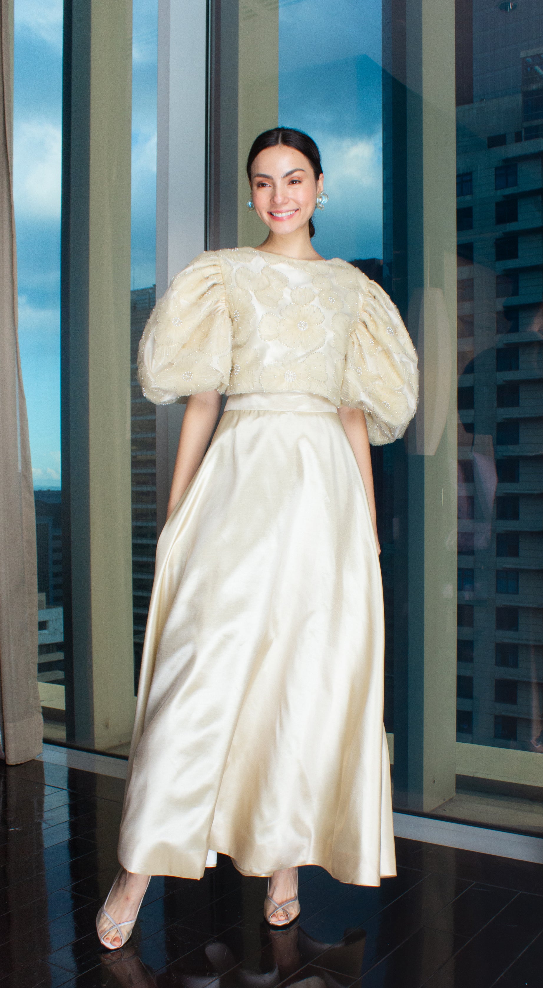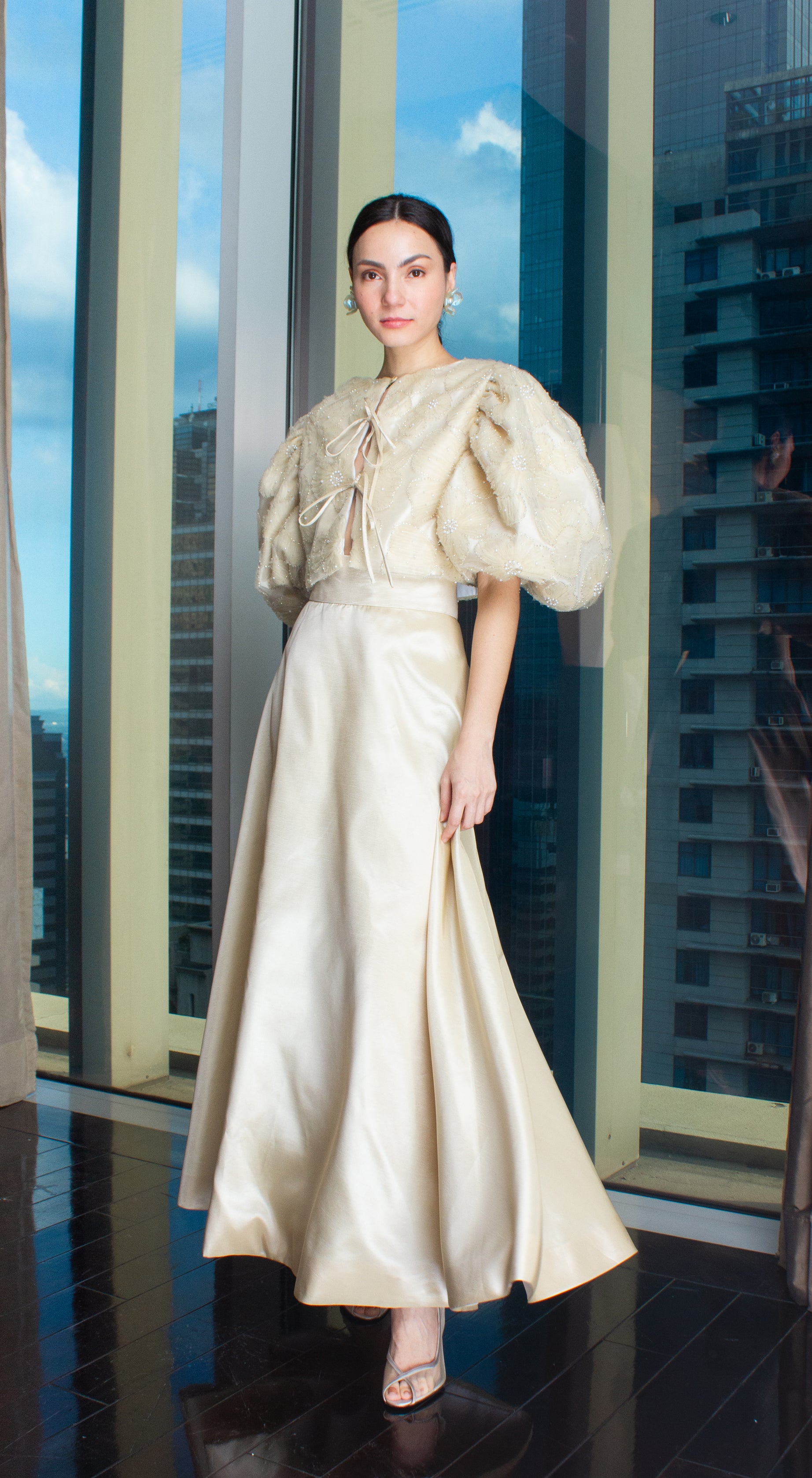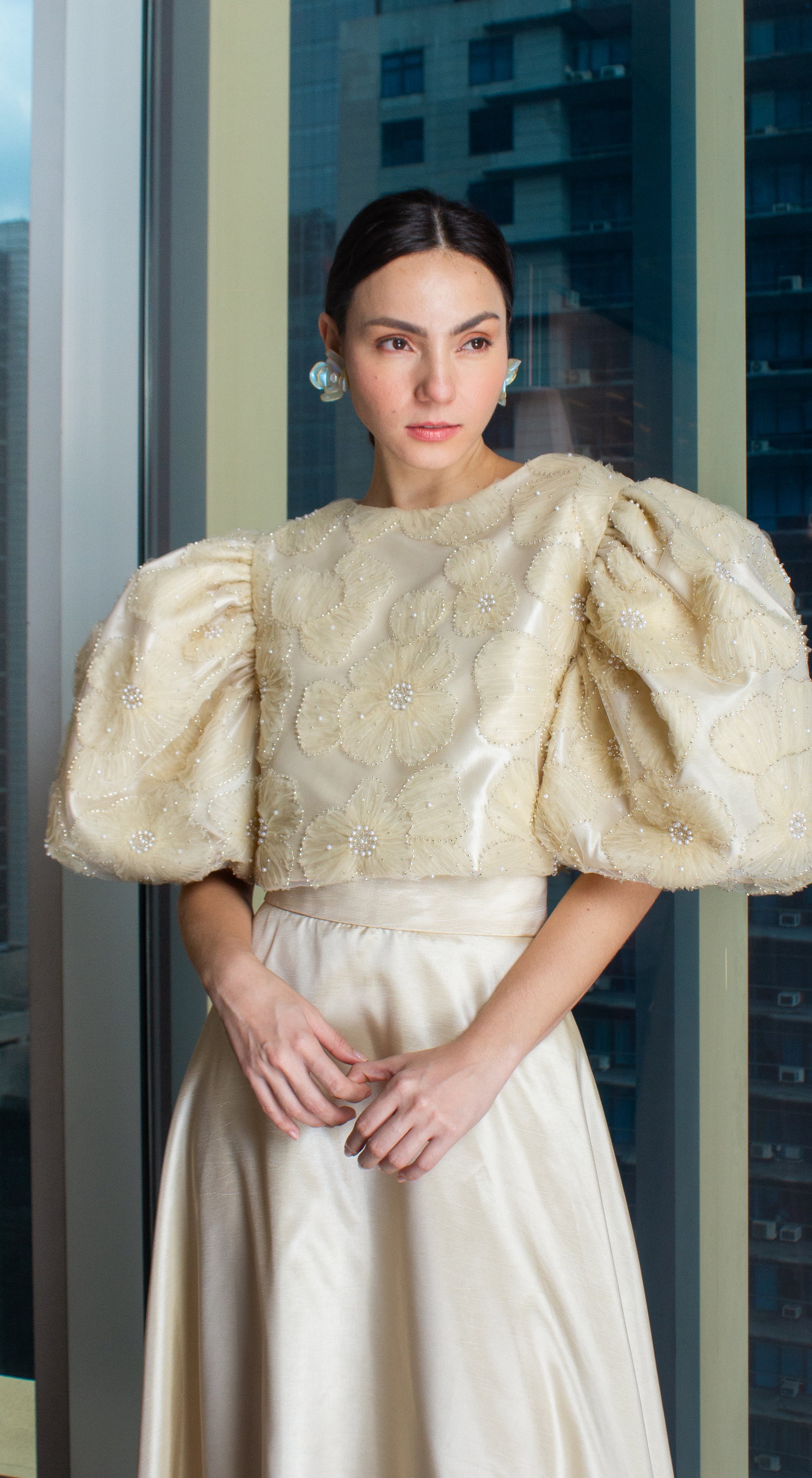 Light Gold Taffeta Beige Lace Puff-Sleeve Open Back Top