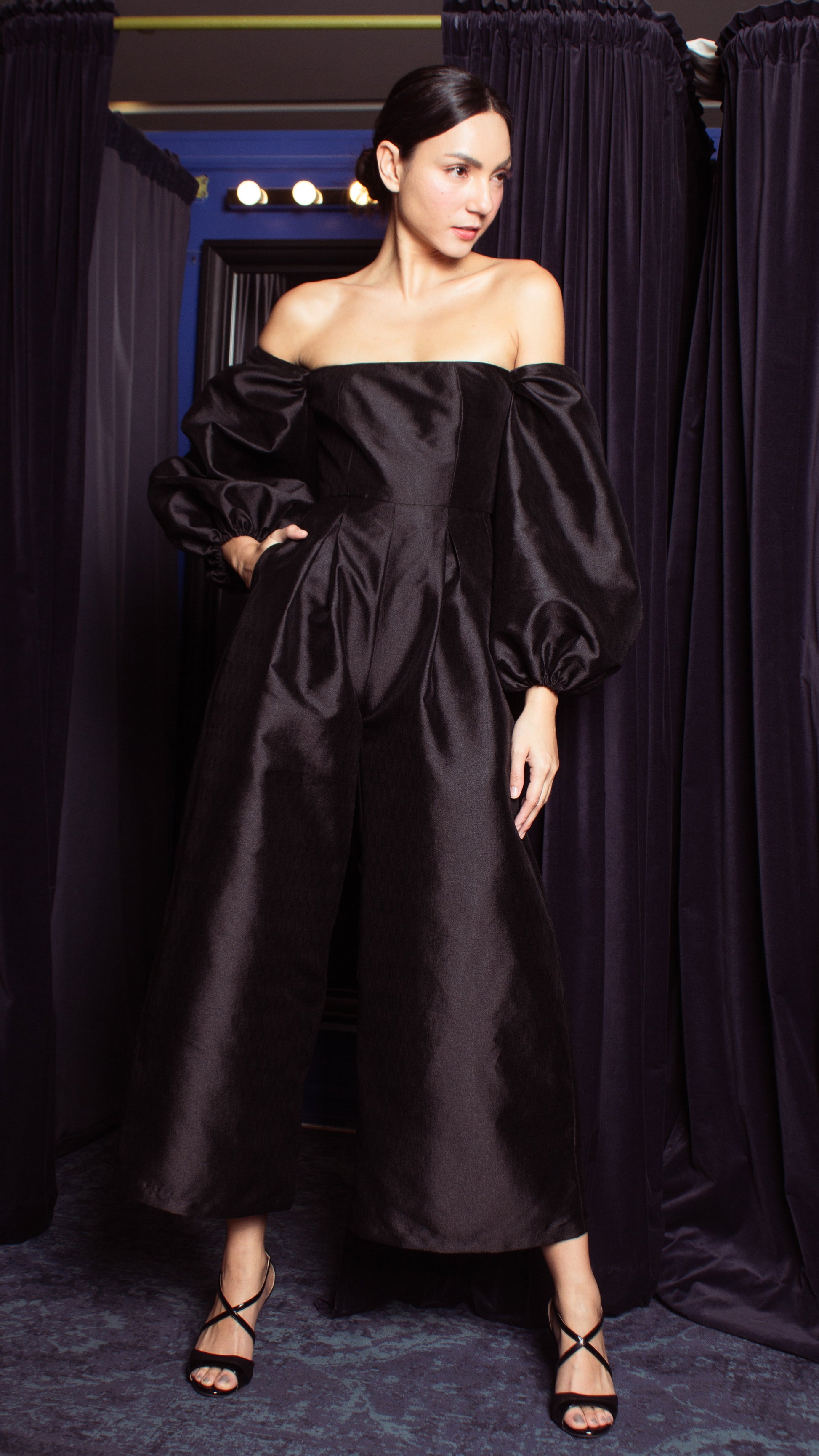Off-Shoulder Wide Hem Jumpsuit - Shimmery Black Gazar