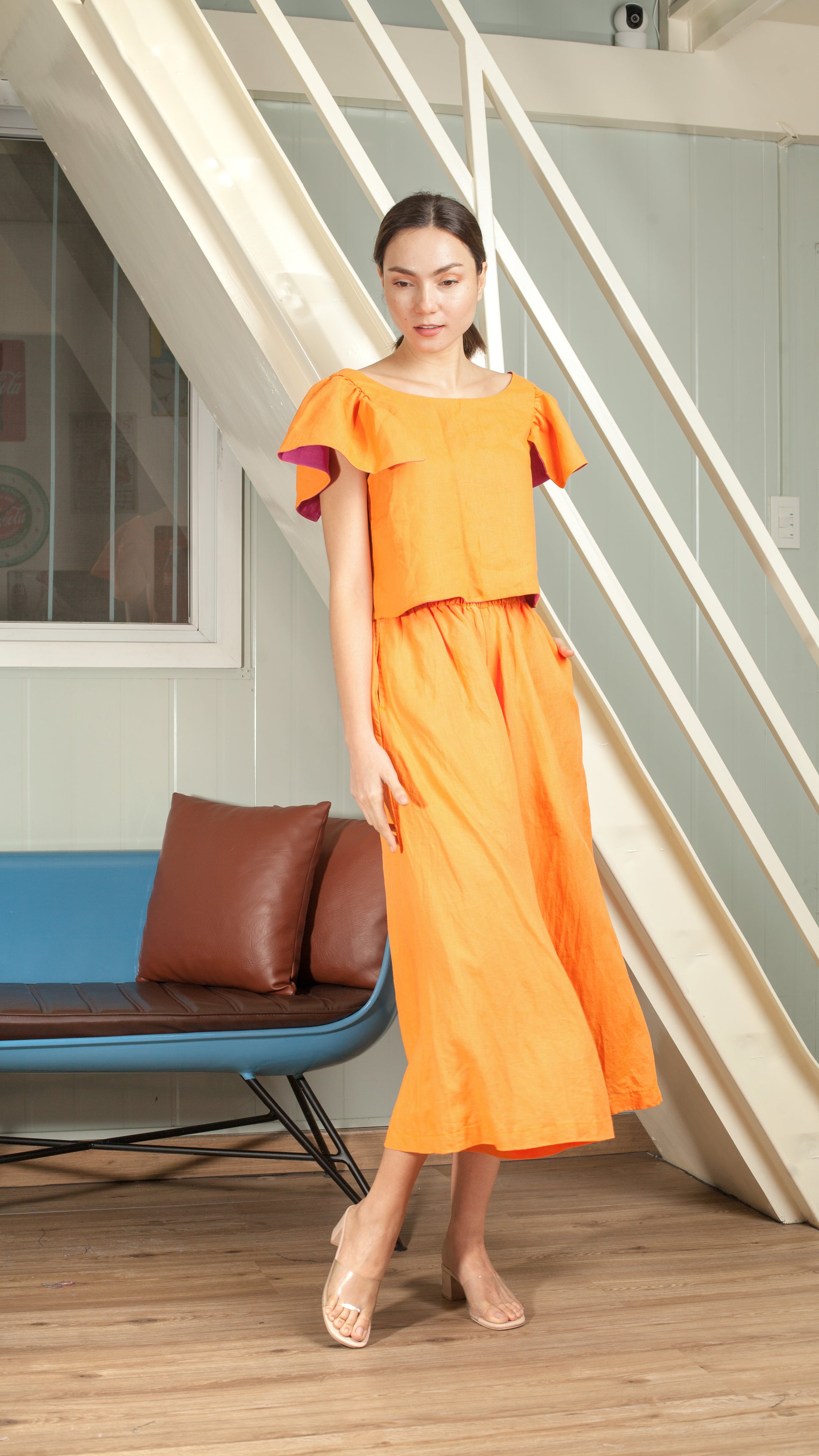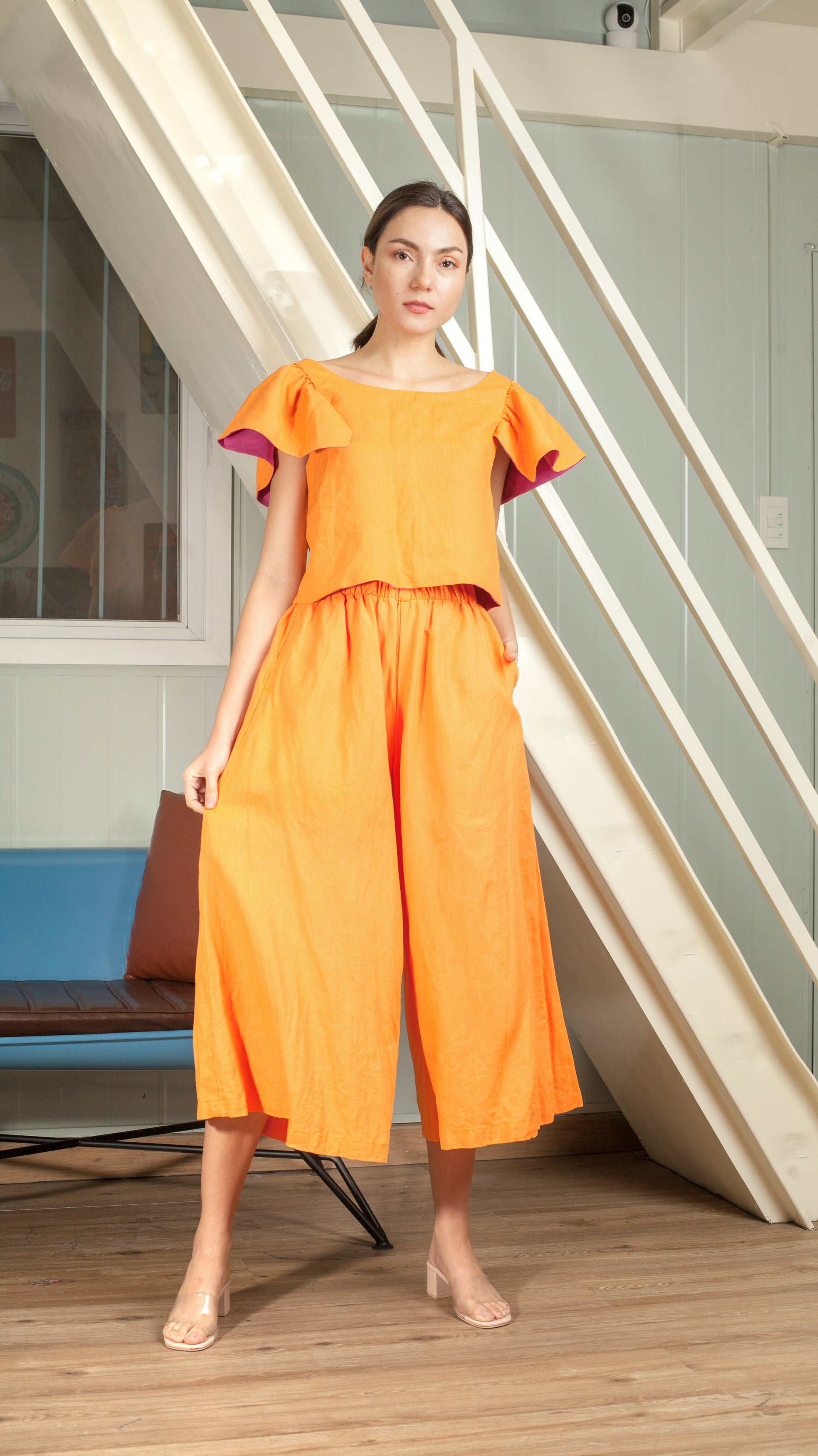 Orange Linen Full Elastic Wide Hem Pants - Petite and Regular