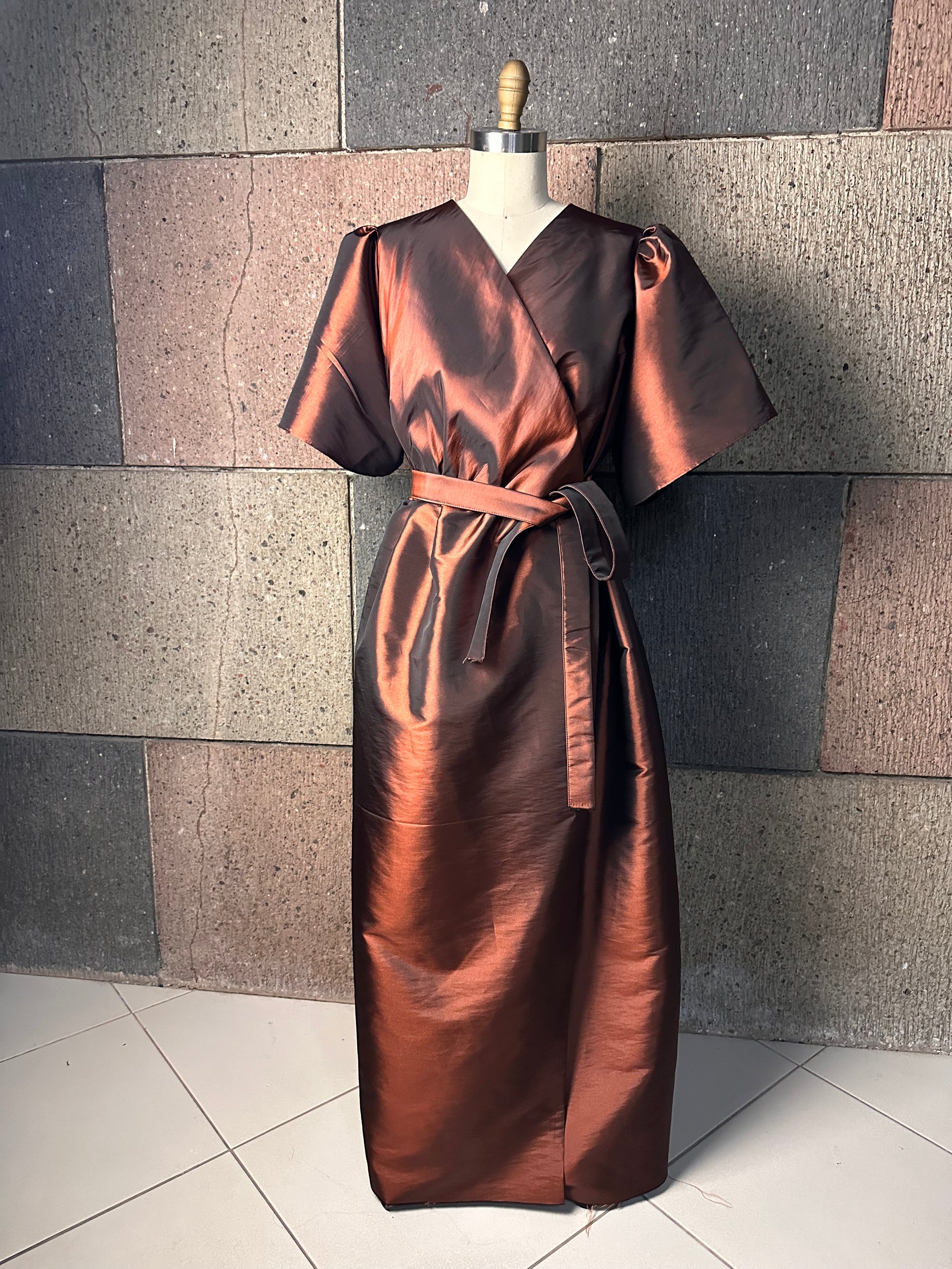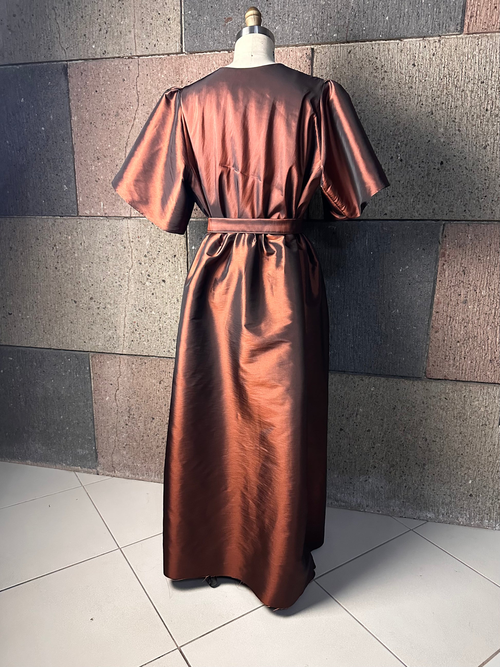 Oversized Puff Sleeve Wrap Dress in Brown Taffeta