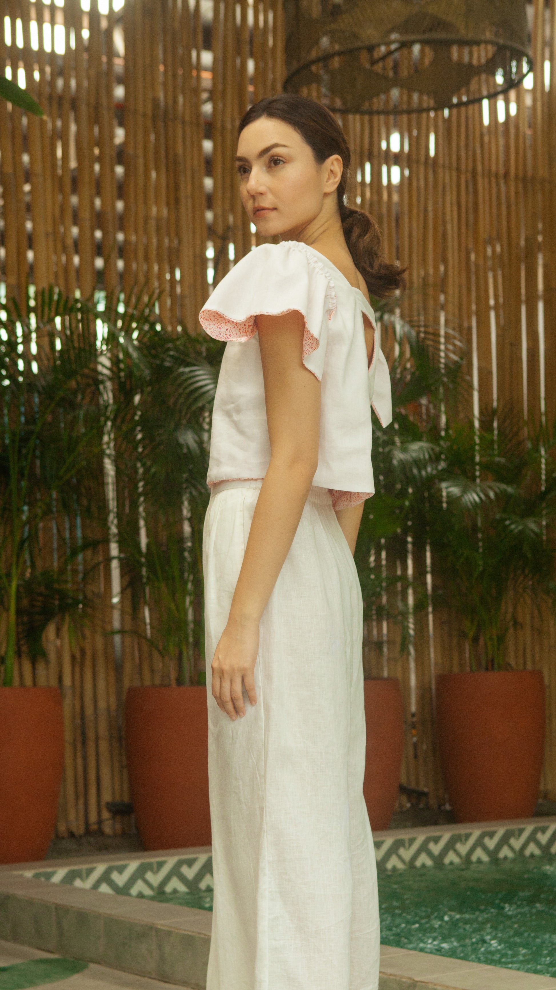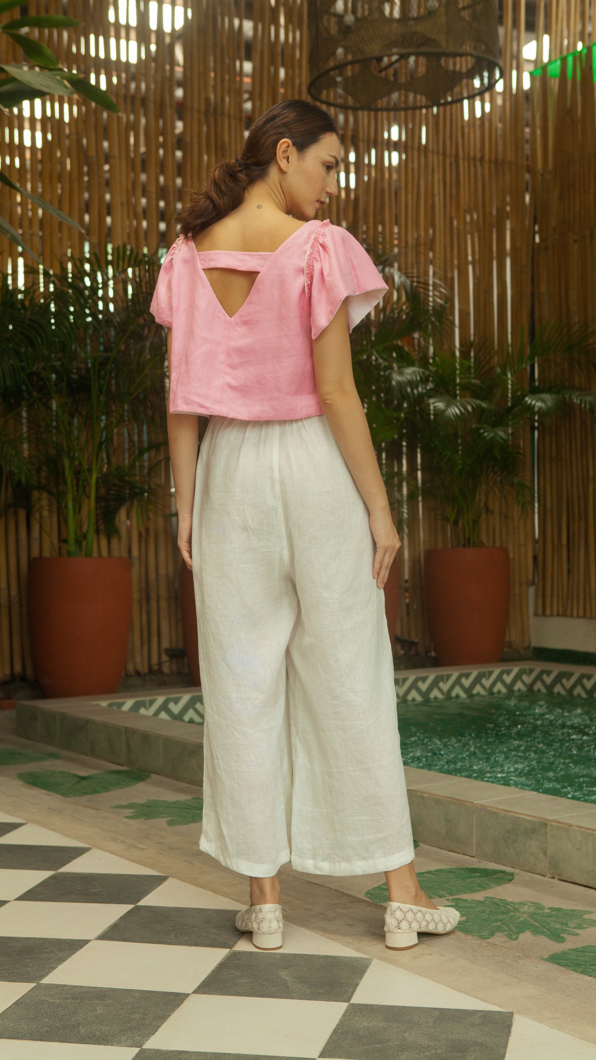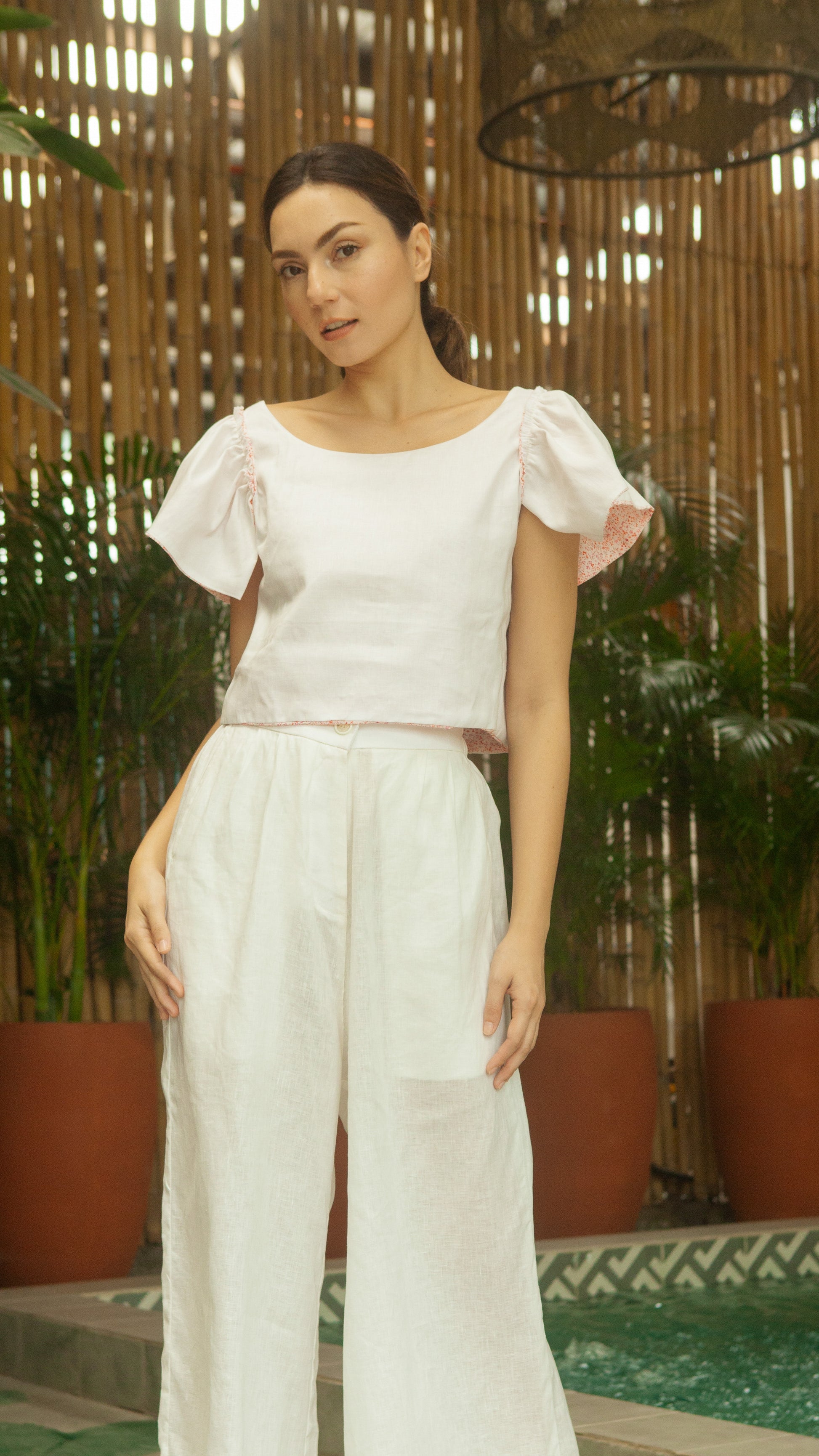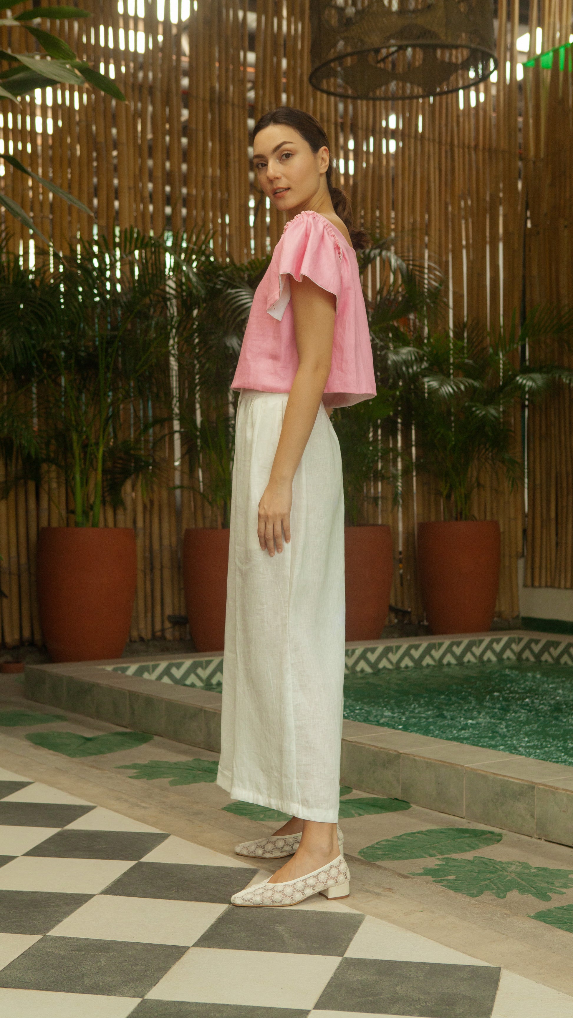 Model's measurements are 5'10" and 31-24-35, wearing white linen and barbie pink linen.