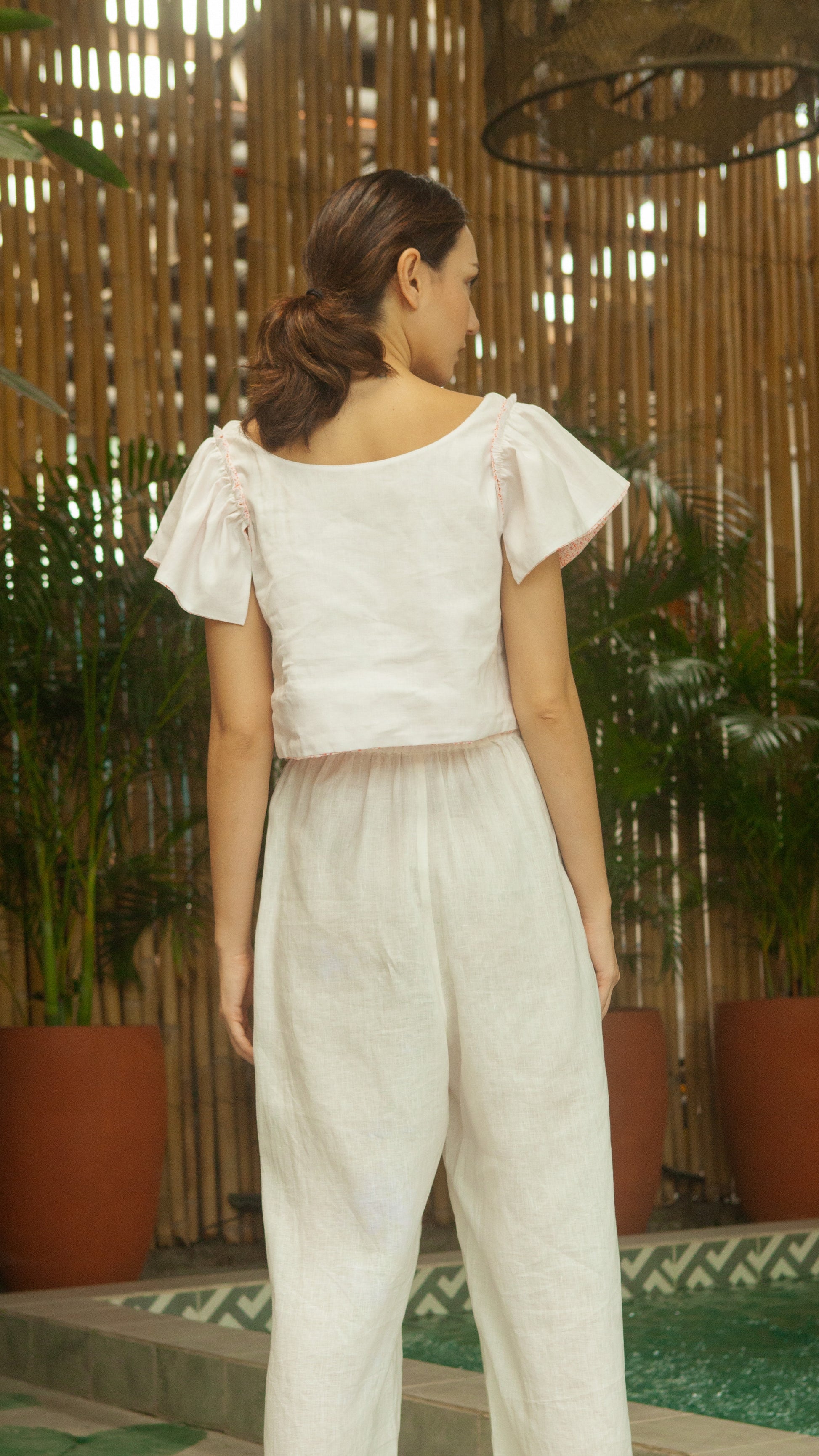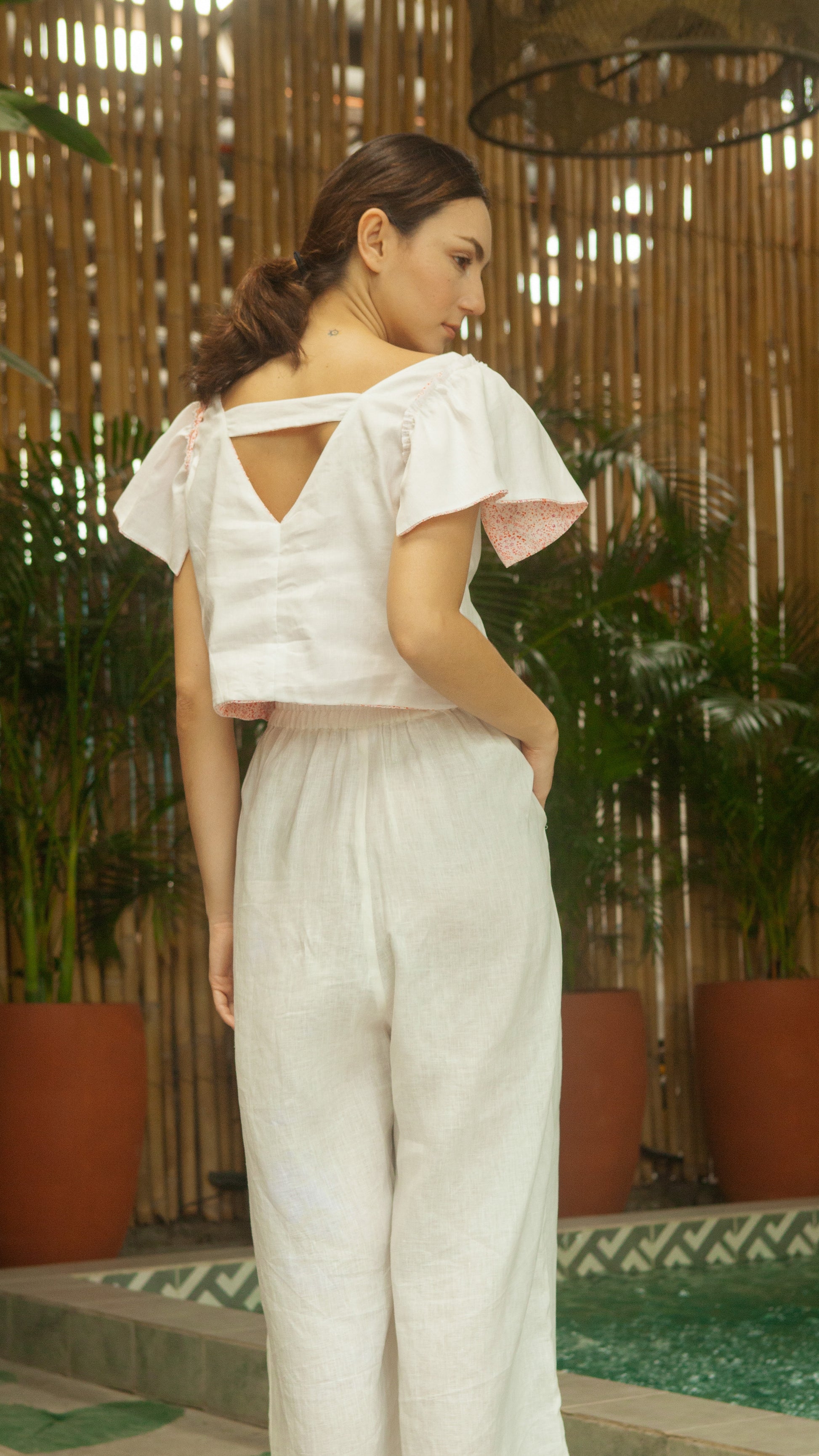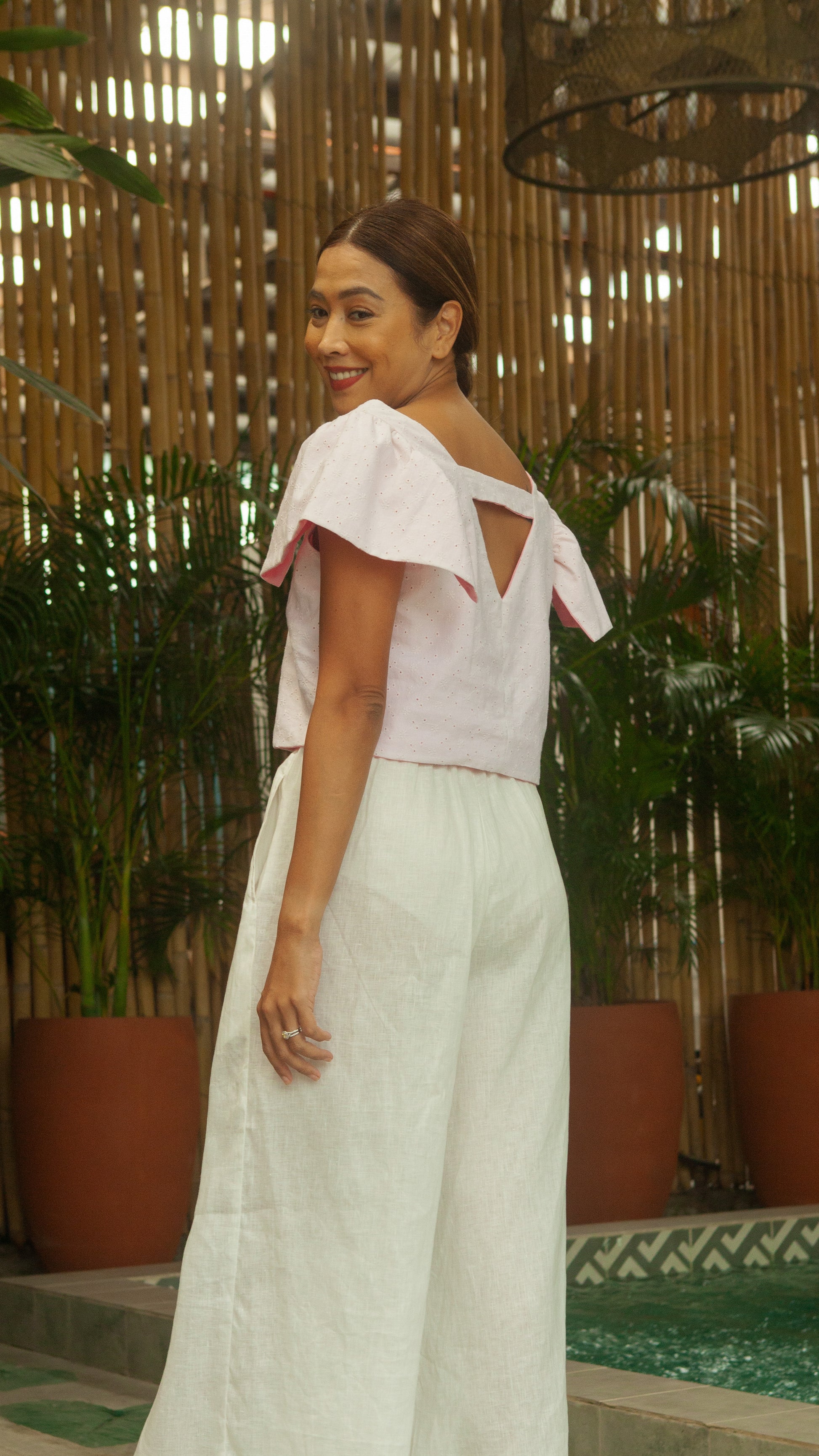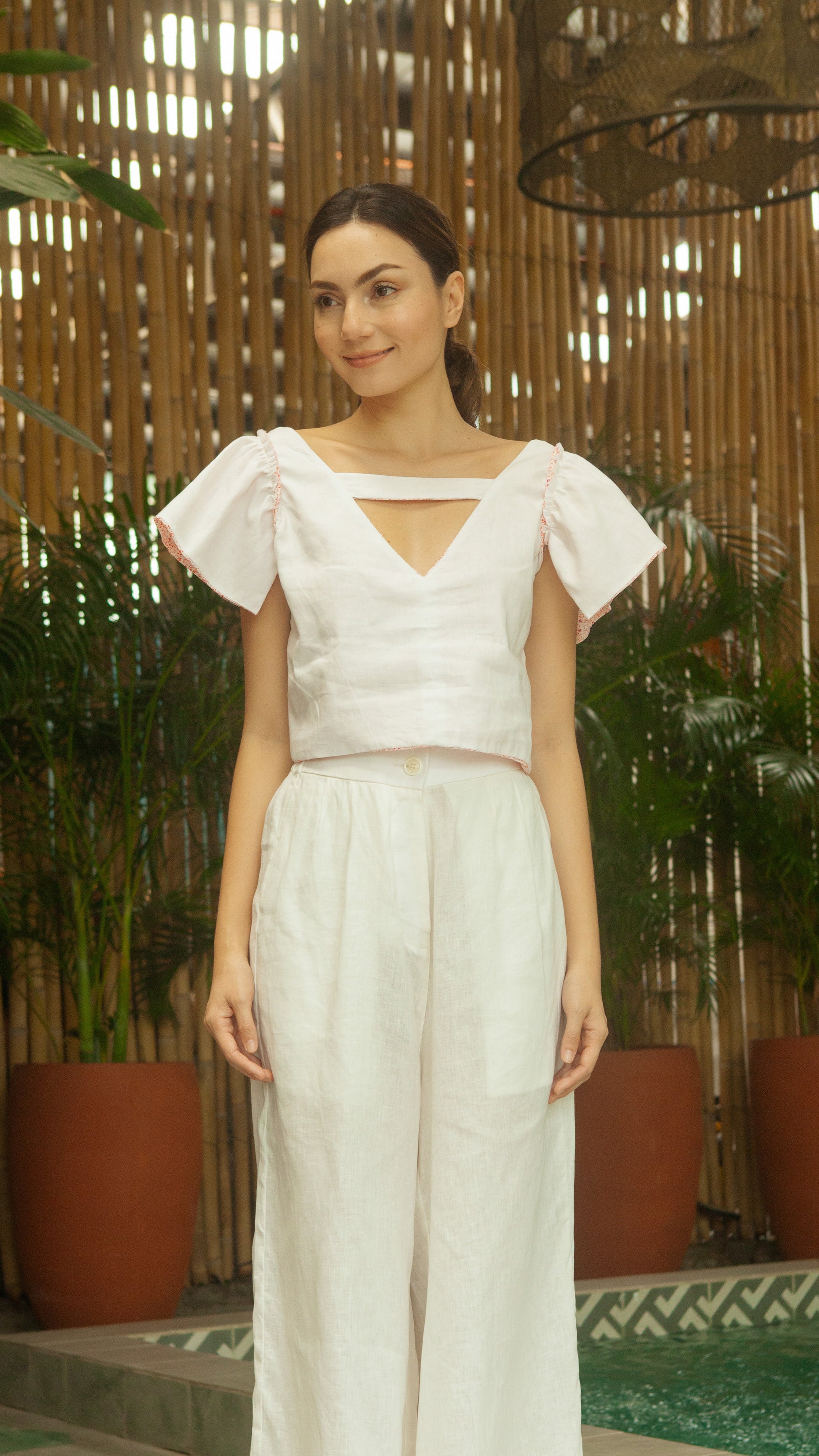 Model's measurements are 5'10" and 31-24-35, wearing white linen and barbie pink linen.