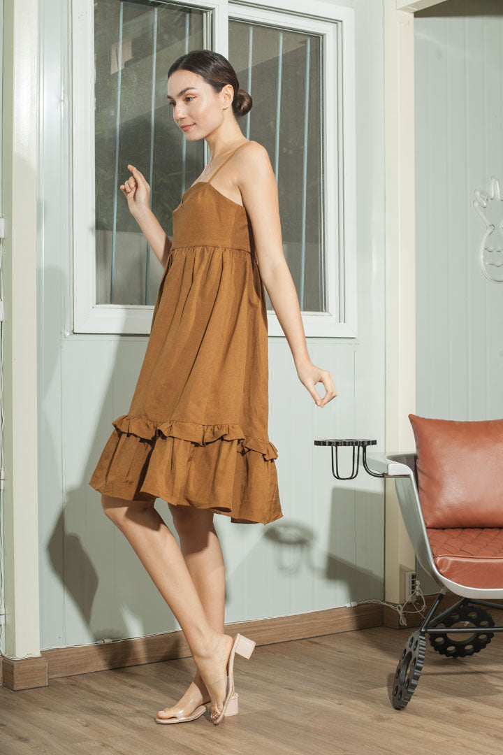 Sweetheart V Cutout Detail Shirred Dress — Brown