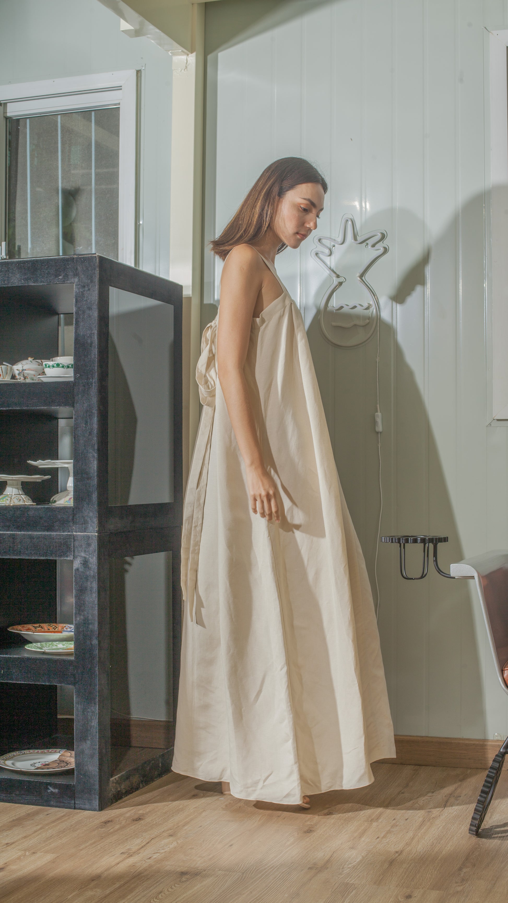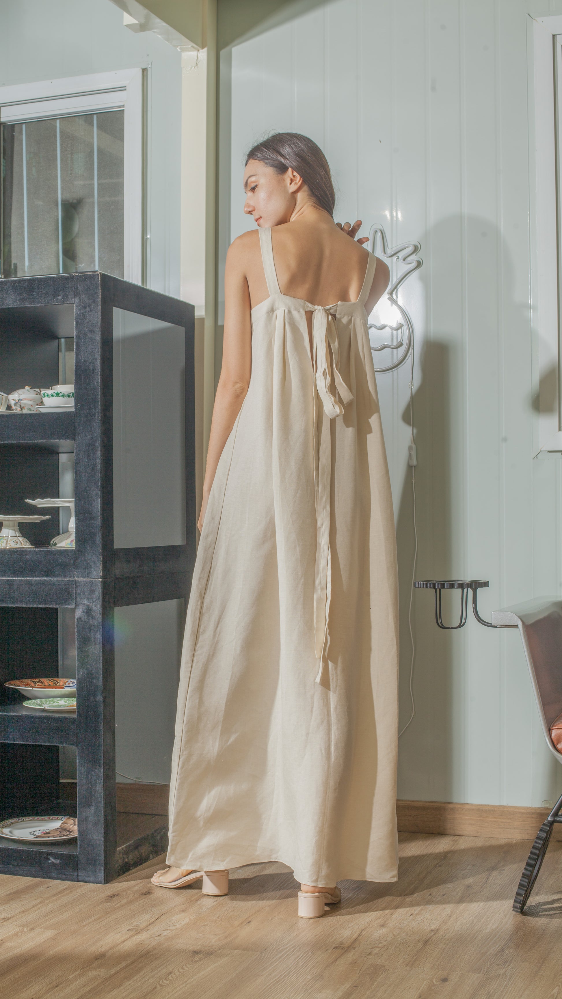Tie Back Ribbon Dress in Beige Linen