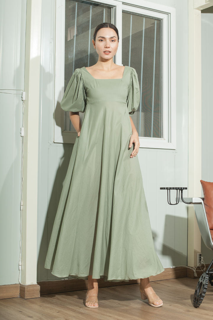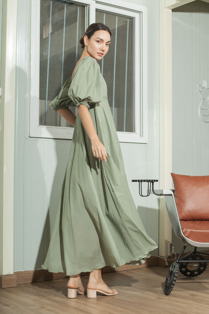 Tuck Front Detail Puff Sleeve Balloon Dress — Sage